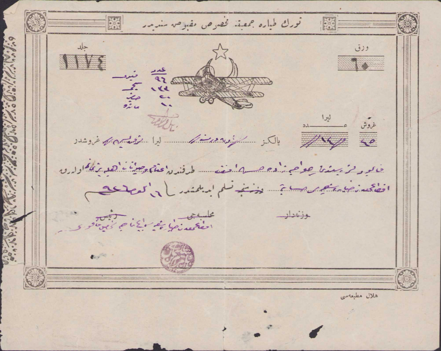 Türk Tayyare Cemiyetine ait makbuz senedi, 1926 tarihli, Hilal Matbaası, mühürlü, 17x13cm