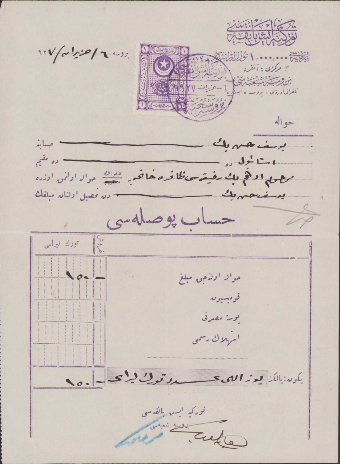 Türkiye İş Bankası Bursa Şubesi hesap pusulası, 1927, pullu damgalı, 15x21cm