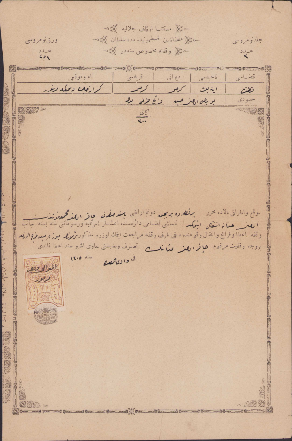 Osmanlı Kastamonu'ya bağlı Dede Sultan Vakfına ait senet, 1305 tarihli, pullu mühürlü, 18x25cm