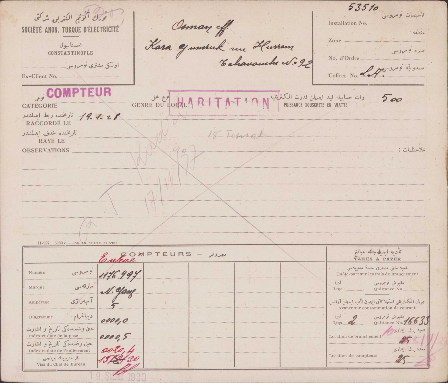 Türkiye Elektrik Şirketi'nin Osmanlıca antetli 1928 tarihli faturası, Osmanlıca-Fransızca yazılı, 25x21cm