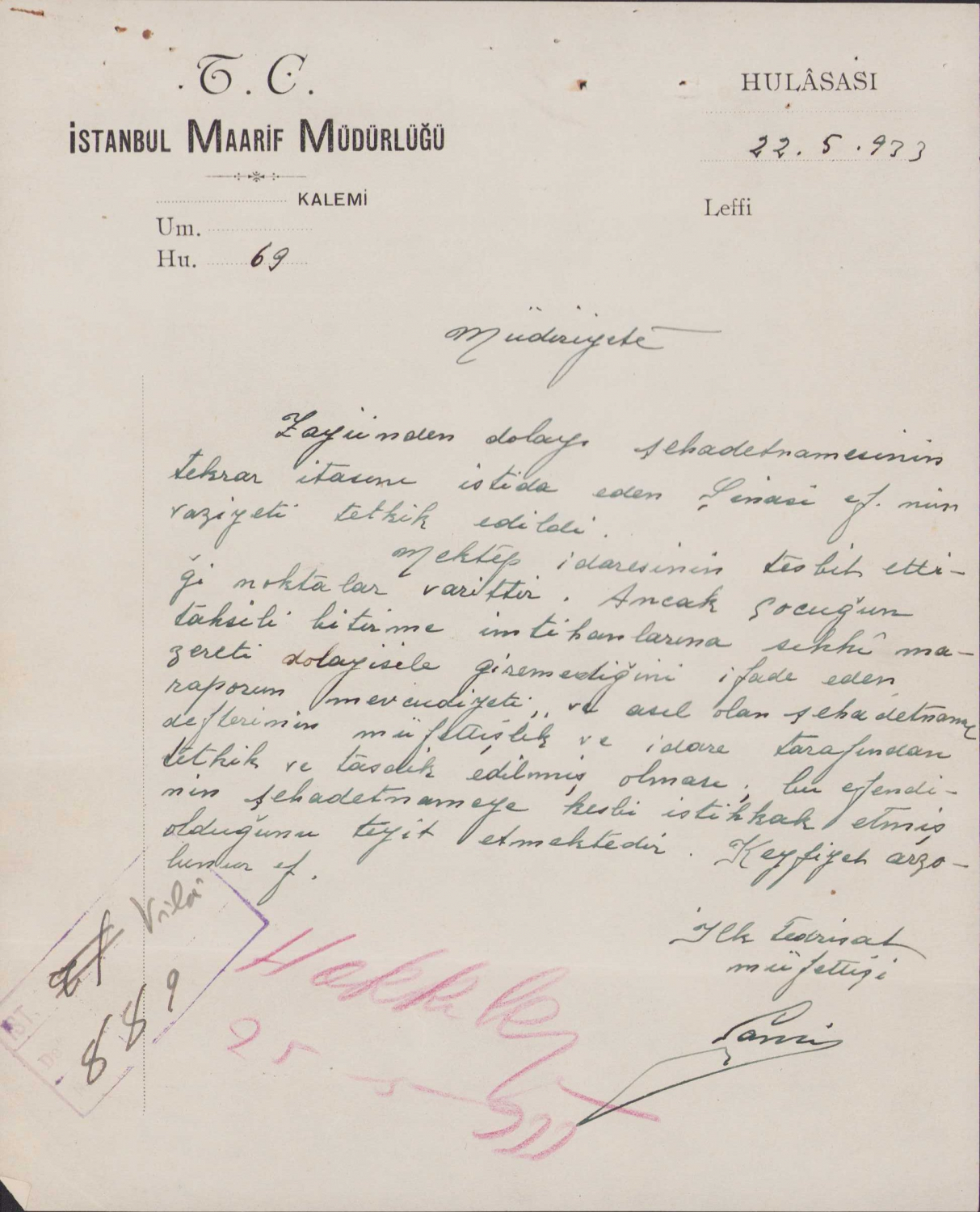 TC İstanbul Maarif Müdürlüğü antetli kağıtta, dilekçe, 1933 tarihli, 16,5x20cm