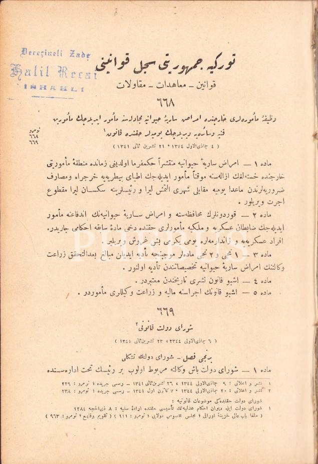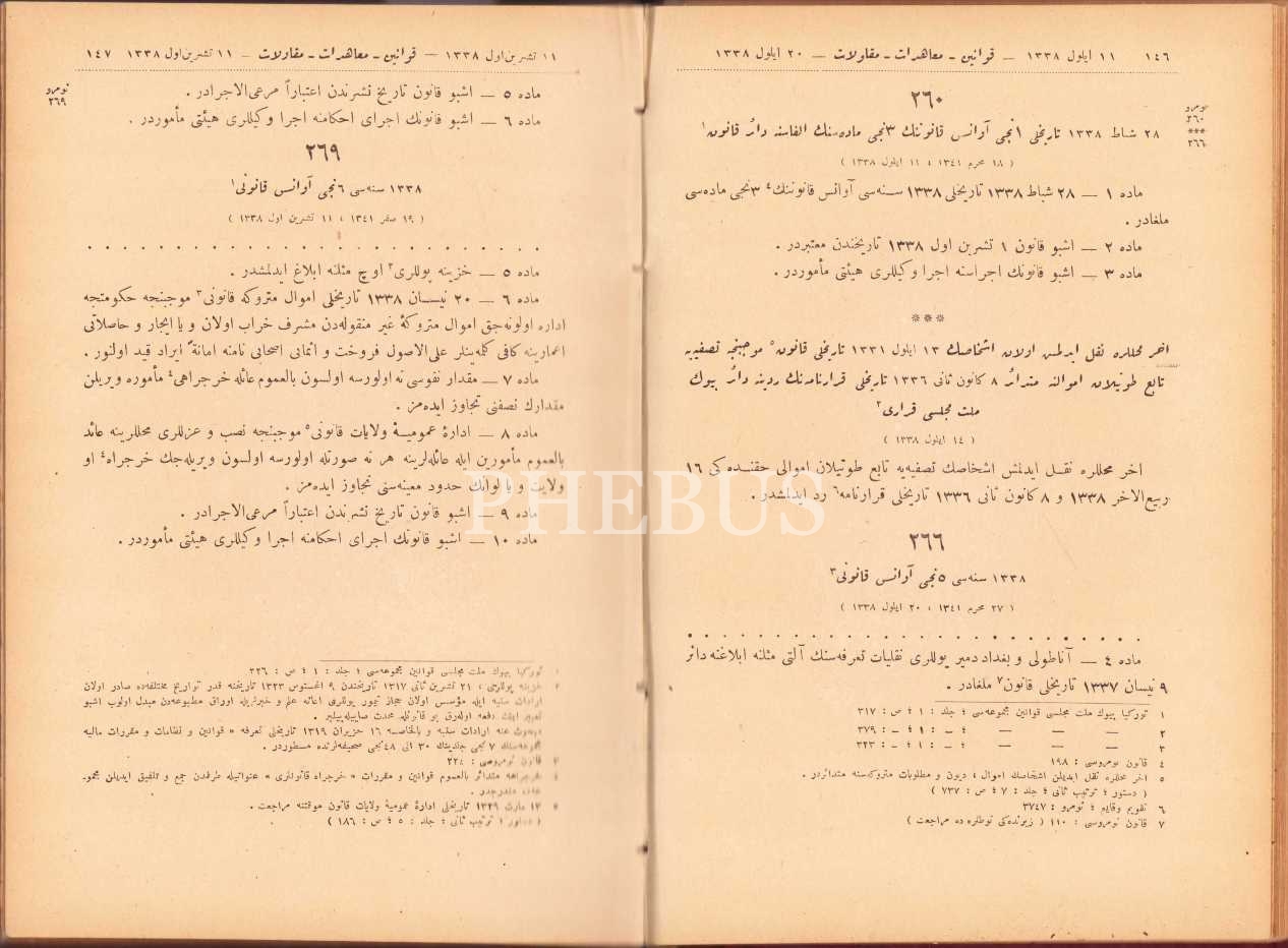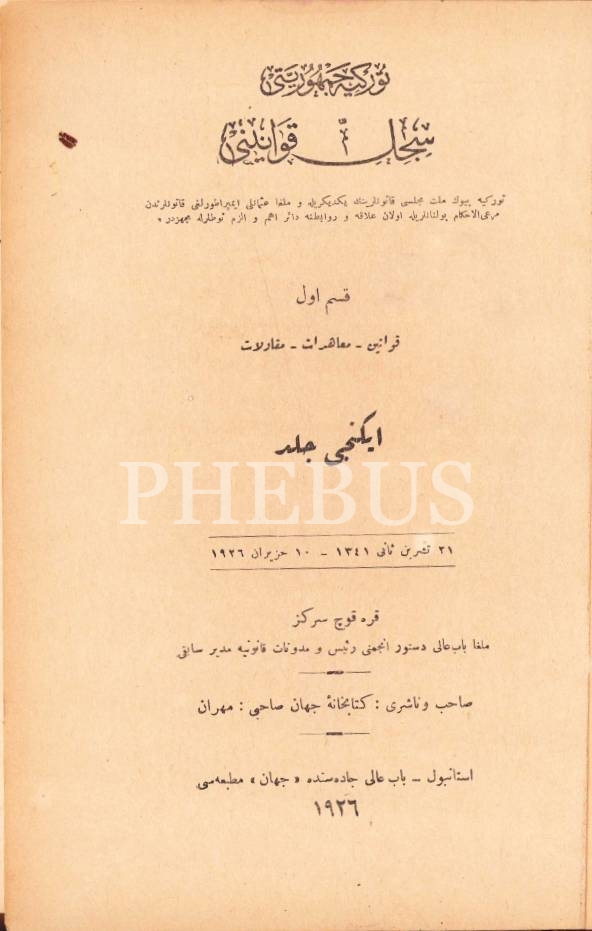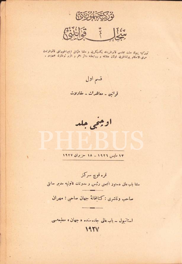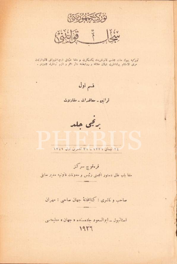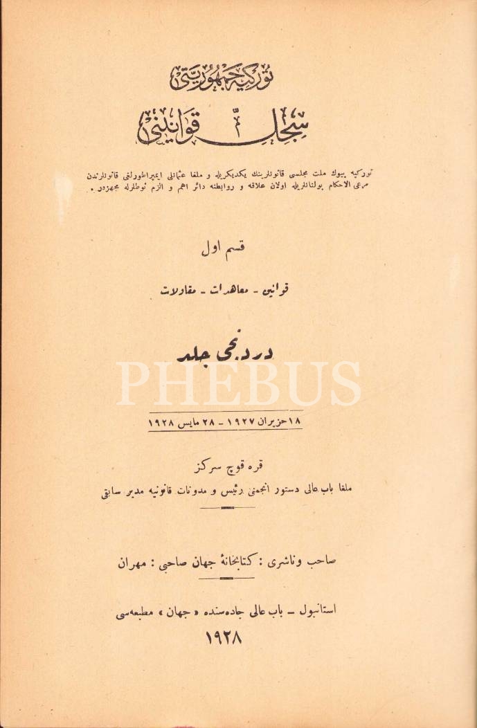 Osmanlıca Türkiye Cumhuriyeti Sicill-i Kavanini [İlk Dört Cild], Karakoç Serkiz, İstanbul, Cihan Matbaası, 1926 tarihli, 1000+892+633+919 sayfa, 17x24 cm