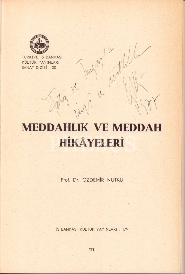 Meddahlık ve Meddah Hikayeleri, Prof. Dr. Özdemir Nutku'dan Fatoş-Turgay Gönenç'e imzalı ve ithaflı, İş Bankası Yayınları, 422 sayfa, 17x24 cm