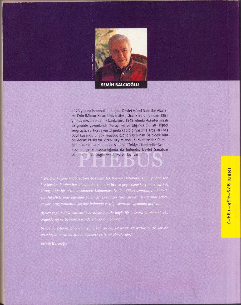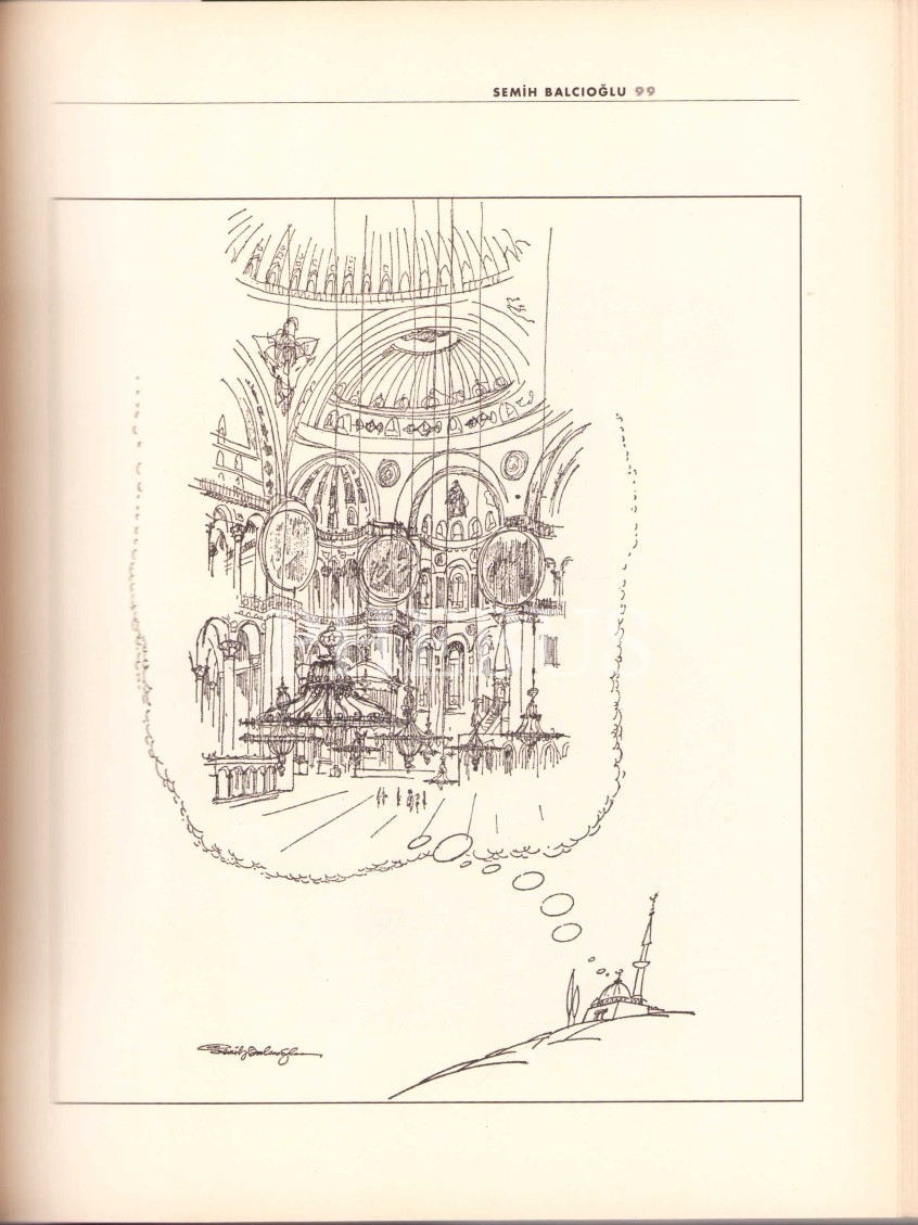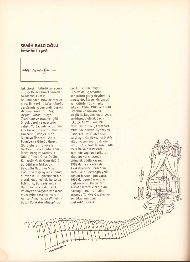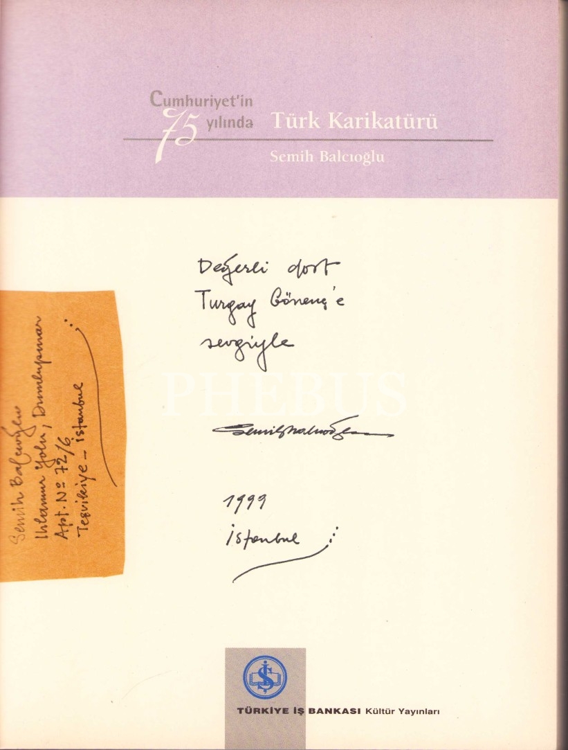 İthaf, "Değerli dost Turgay Gönenç'e sevgiyle, Semih Balcıoğlu, 1999 İstanbul" şeklindedir. 1928 İstanbul'da doğdu. Işık Lisesi'ni ve Devlet Güzel Sanatlar Akademisi'nin Grafik Bölümü'nü bitirdi. İlk karikatürünü 1943 yılında Akbaba Dergisi'ndeki Genç Fırçalar bölümünde yayınladı, o günden sonra karikatürü hiç bırakmadı. Amcabey, Akşam, Dünya, Hürriyet ve Tercüman, Politika, Yeni Yüzyıl gazetelerinde çalıştı. Çarşaf ve Çivi dergilerini yönetti. Meslek hayatı boyunca 49 ödül kazandı ve Gabrova Mizah Evi'nin yaptığı oylama sonucu dünyanın en iyi 106 çizerinden birisi oldu. Türkiye’de ilk üç boyutlu karikatürü gerçekleştirdi. 67 kişisel sergi açtı. 1969'da iki arkadaşıyla beraber Karikatürcüler Derneği'ni kurdu ve 7 dönem derneğin başkanlığını yaptıktan sonra 1996'da derneğin onursal başkanı seçildi. 1973-1979 arasında Türkiye Gazeteciler Sendikası'nın başkanlığında bulundu. Karikatürlerini 60 kişisel sergide sergiledi, 19 karikatür kitabı yayımlandı. 27 Ekim 2006 günü geçirdiği kalp krizi sonucu hayatını kaybetti.