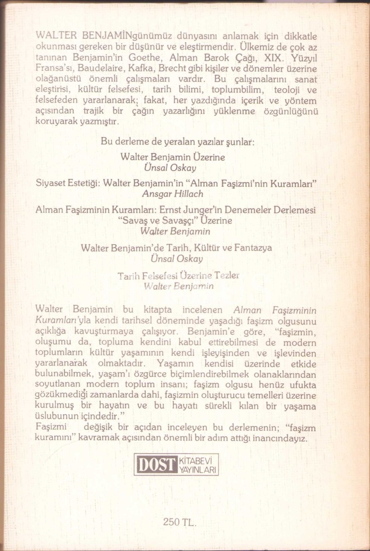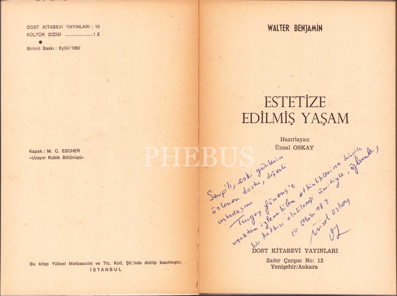Estetize Edilmiş Yaşam, Walter Benjamin, Çeviren Ünsal Oskay'dan Turgay Gönenç'e imzalı ve ithaflı, Dost Kitabevi Yayınları, Ankara, İlk Baskı, 1982, 182 sayfa, 13x20 cm
