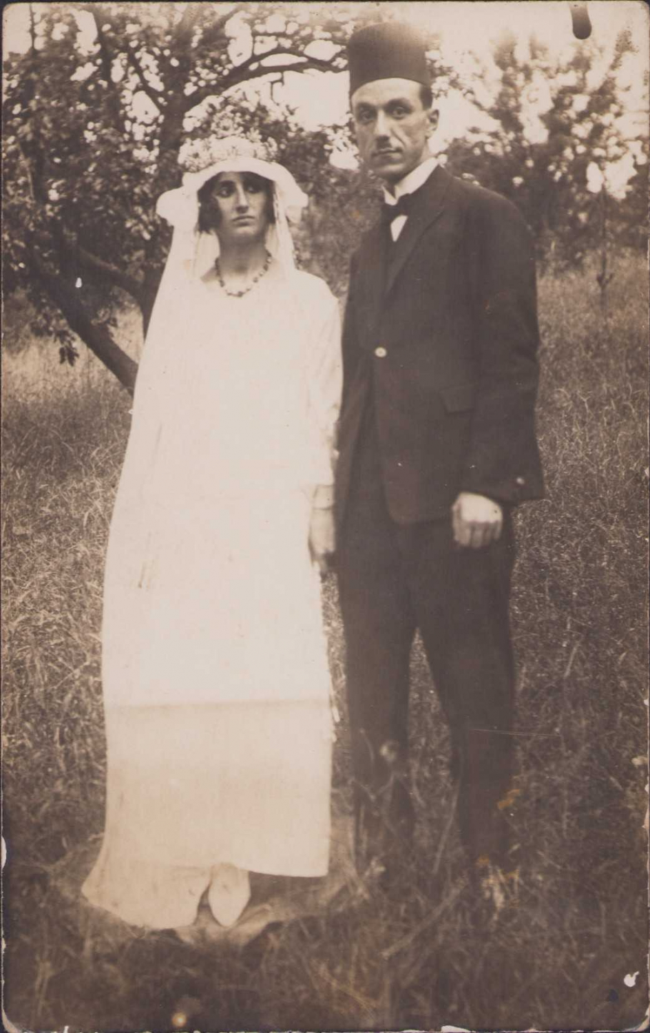 Düğün fotoğrafı, açık alanda poz veren gelin ve damat, fes ve şapka detaylı, 9x14cm