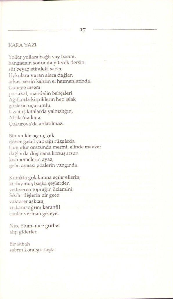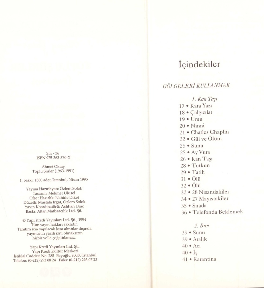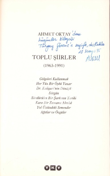 İthaf, "Ahmet Oktay'dan hüzünler bileycisi Turgay Gönenç'e sevgiyle, dostlukla, 18 Mayıs 95 Ahmet Oktay" şeklindedir.