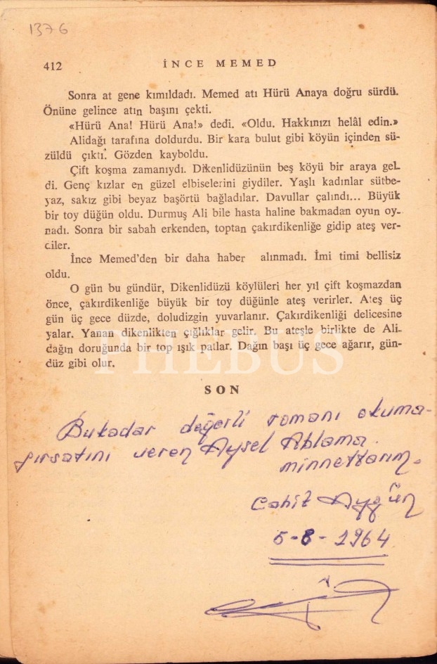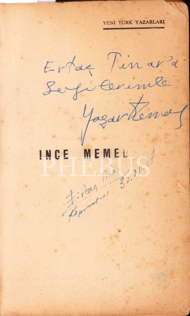 İthaf, Ertaç Tinar'a sevgilerimle, Yaşar Kemal" şeklindedir.