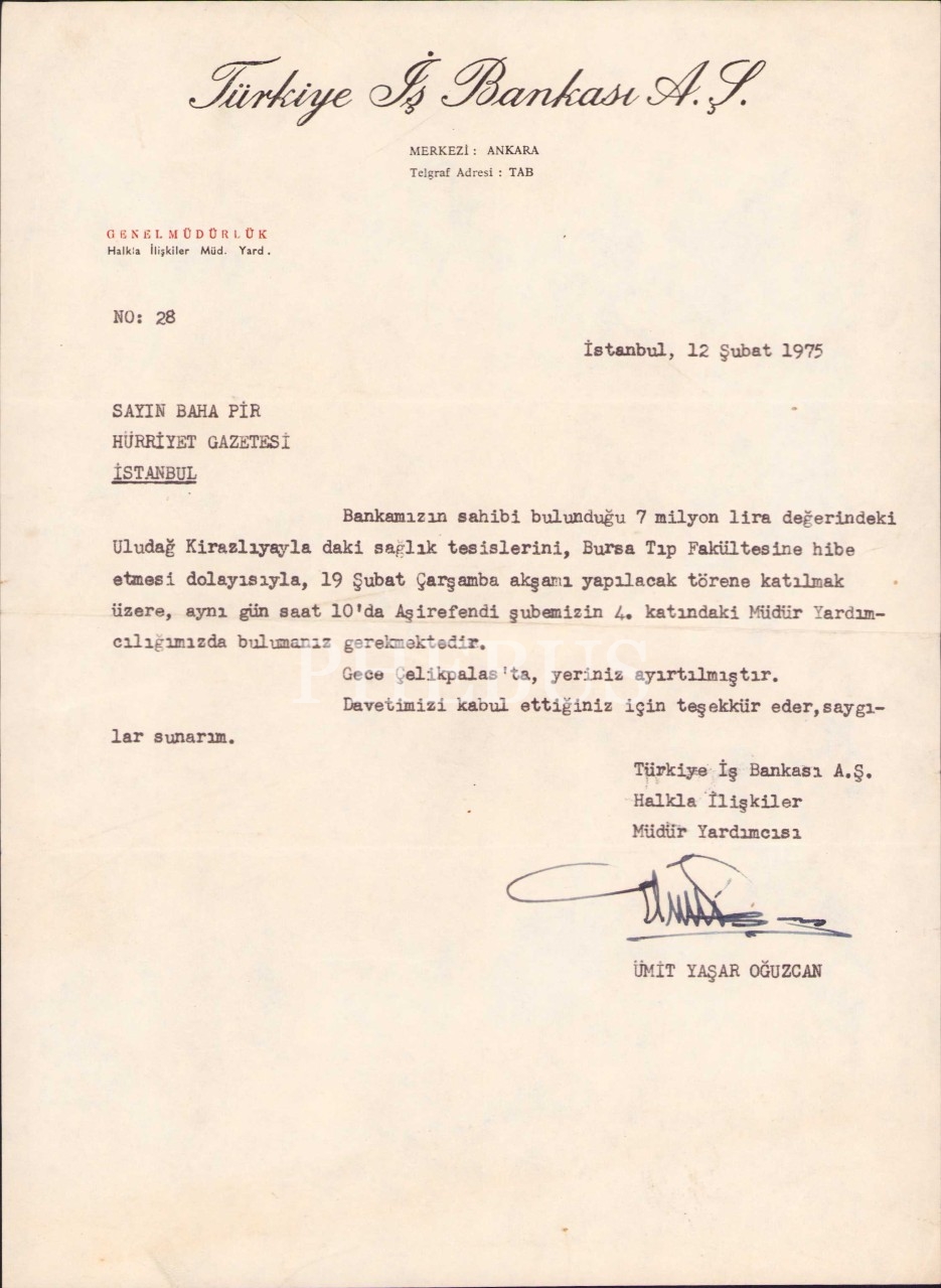 Türkiye İş Bankası A.Ş. antetli, 1975 tarihli açılış töreni davetiyesi, Halkla İlişkiler Müdür Yardımcısı Ümit Yaşar Oğuzcan'dan imzalı, 19x26 cm