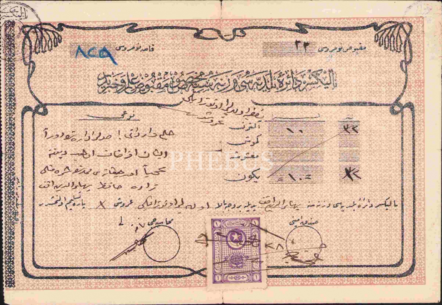 Balıkesir Belediye veznesine mahsus makbuz ilmuhaberi, Osmanlıca, 19x13 cm