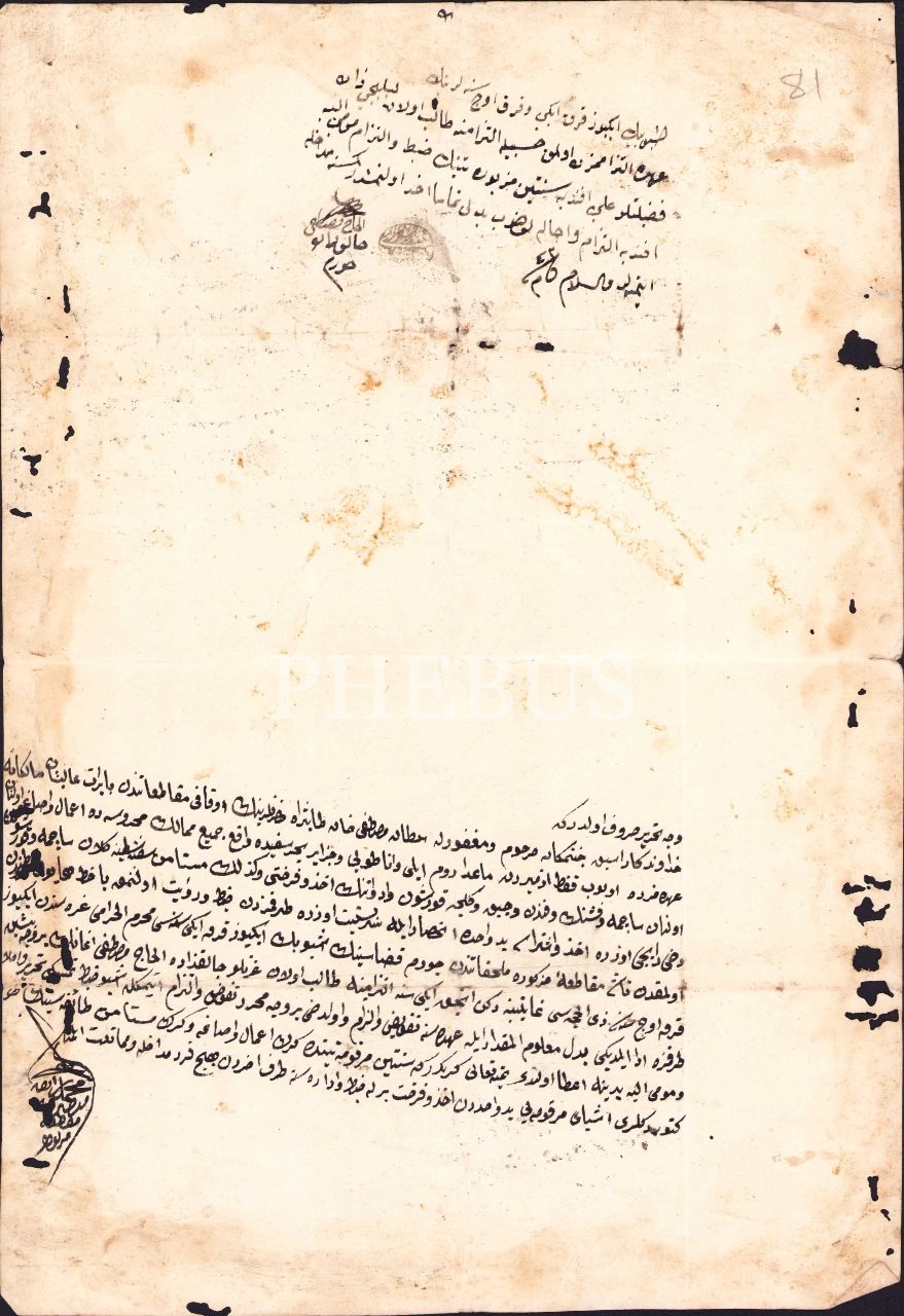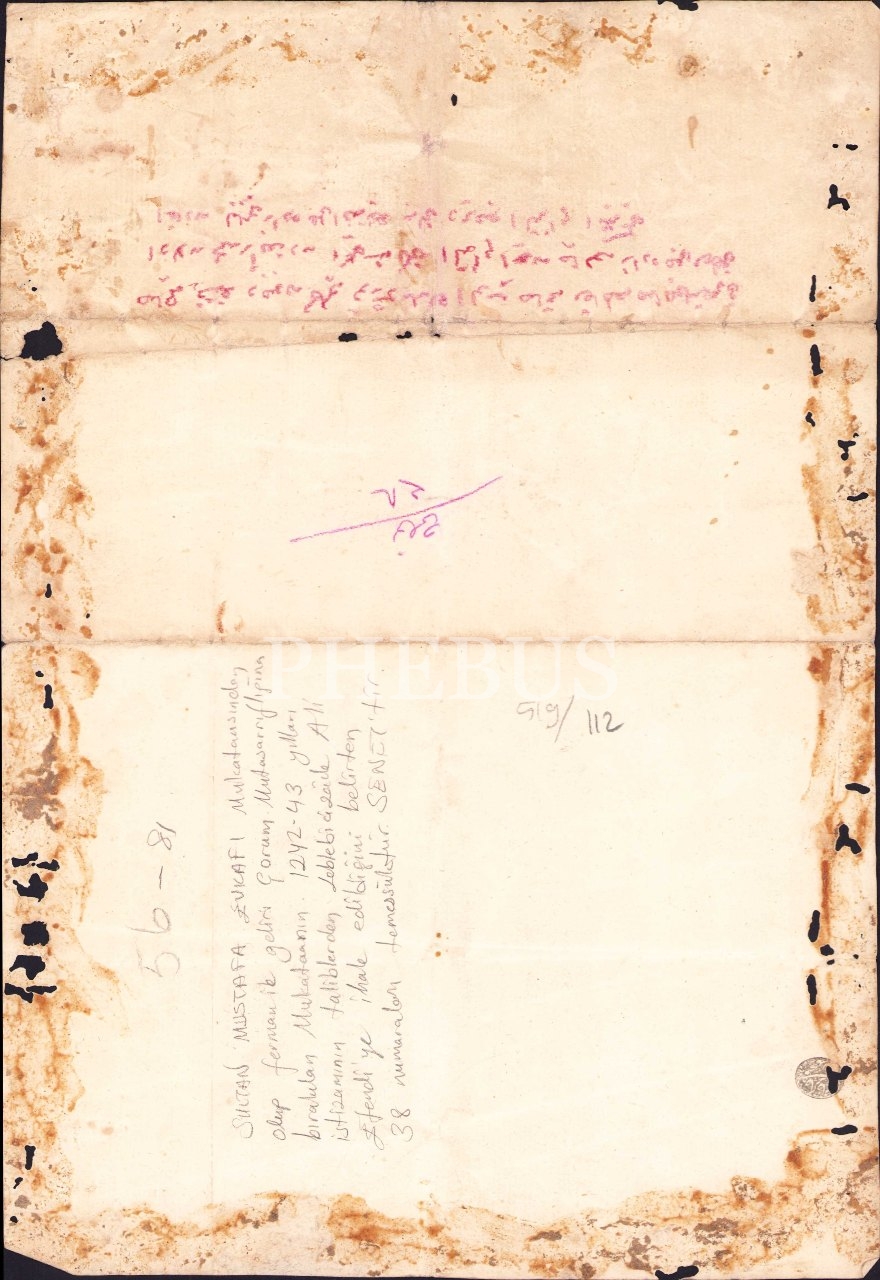 Sultan Mustafa Evkafı Mukatasından olup ferman ile geliri Çorum Mutasarrıflığına bırakılan mukataaların 1242 - 43 yılları taliplerden Leblebici Zade Ali Efendi'ye ihale edildiğini belirten 38 numaralı temessük senettir, haliyle, 26x35 cm