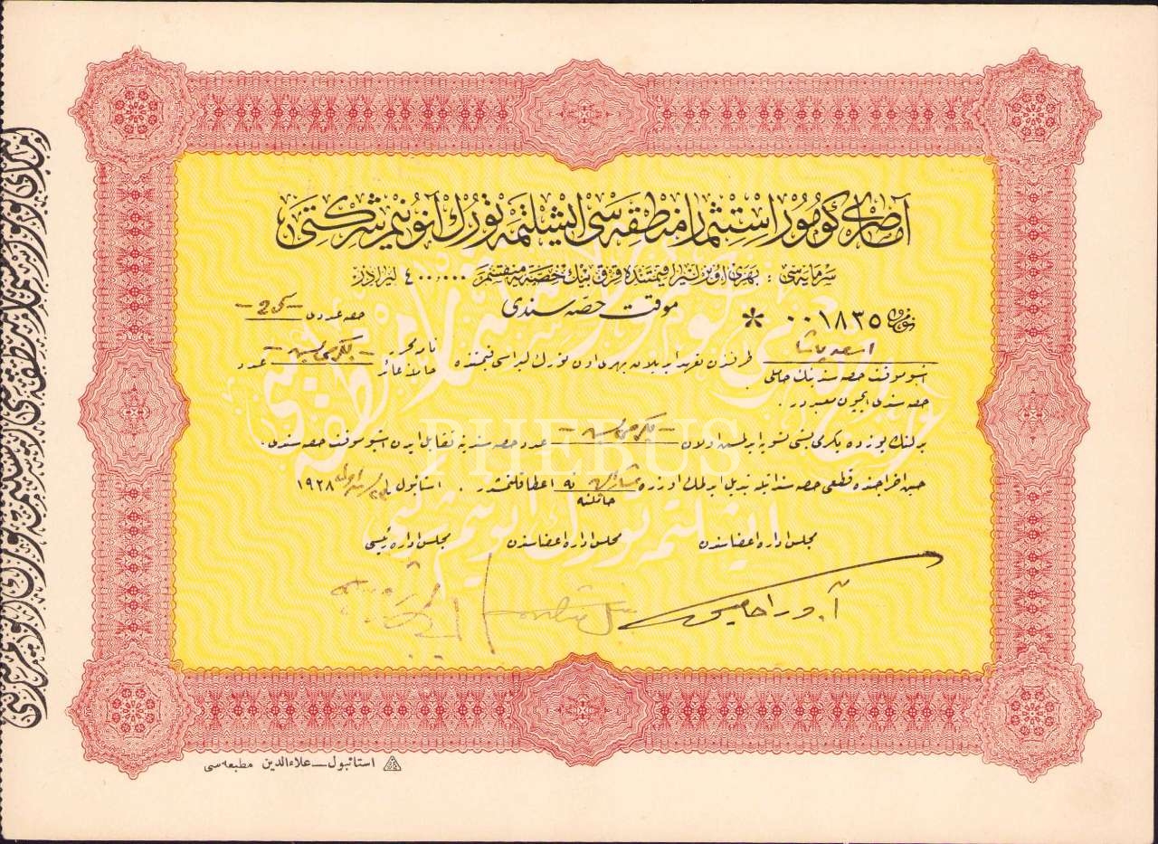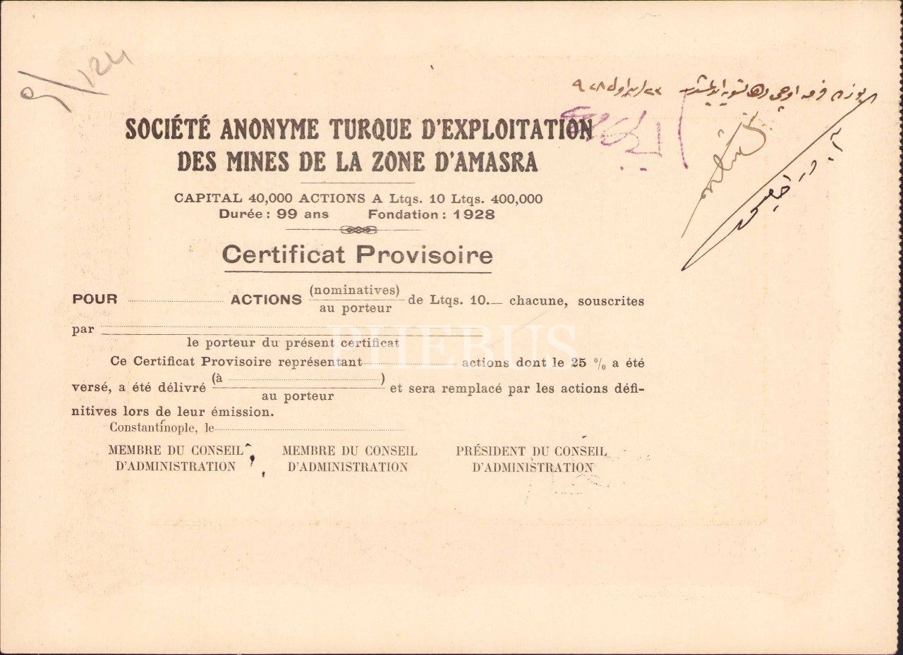 Amasra Kömür İstismar Mıntıkası İşletme Türk Anonim Şirketi 1928 hisse senedi, Osmanlıca - Fransızca, 20x14 cm