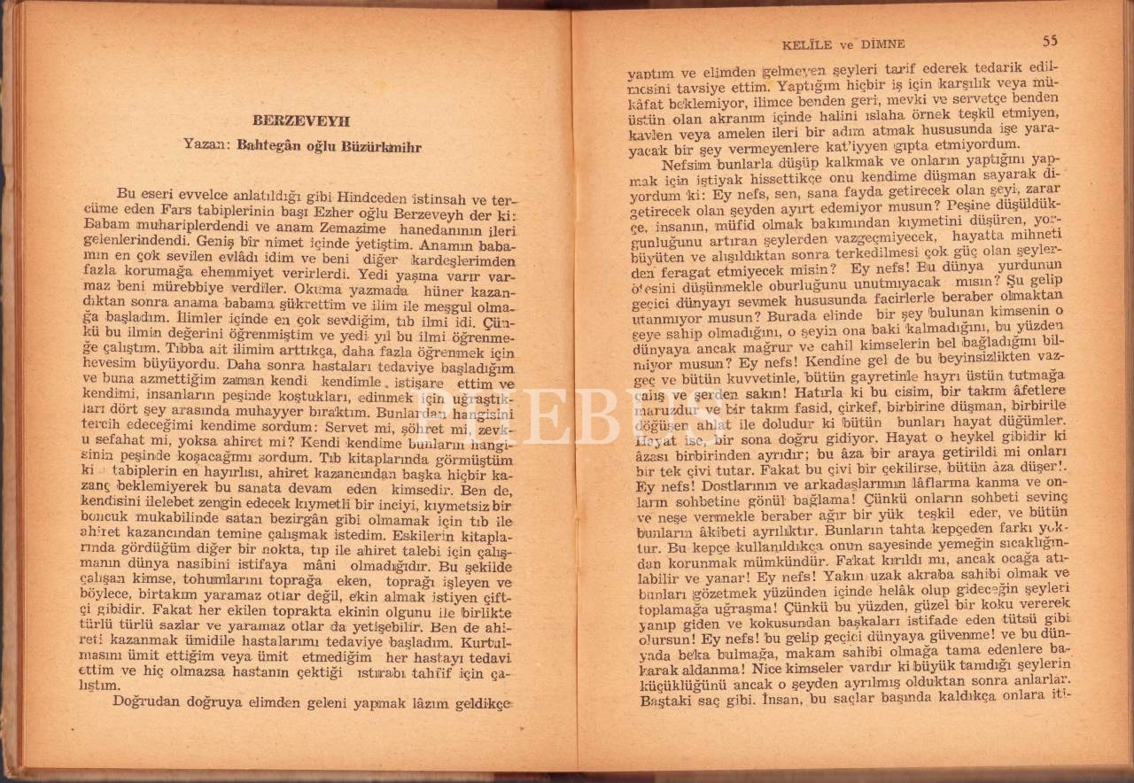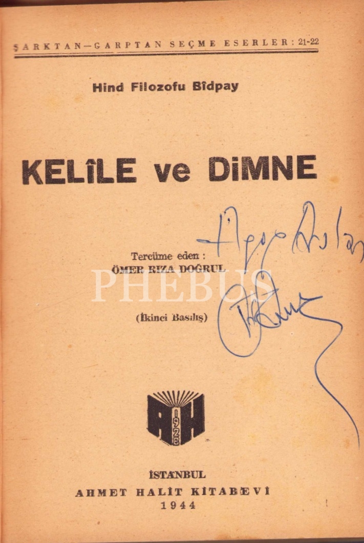 Hind Filozofu Bidpay Kelile ve Dimne, tercüme eden Ömer Rıza Doğrul, İkinci baskı, İstanbul 1944, 205 sayfa, 13x18 cm