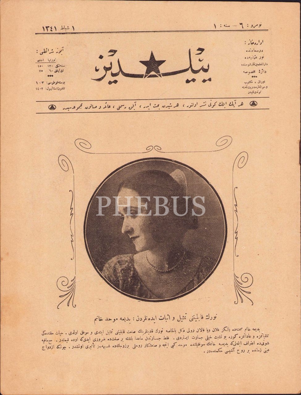 Osmanlıca Yıldız Mecmuası, 1 Şubat 1341, Sayı:6, kapak: Türk Kabiliyetini Temsil ve İspat Edenlerden: Bedia Muvahhit Hanım, 14 sayfa, 22x29 cm