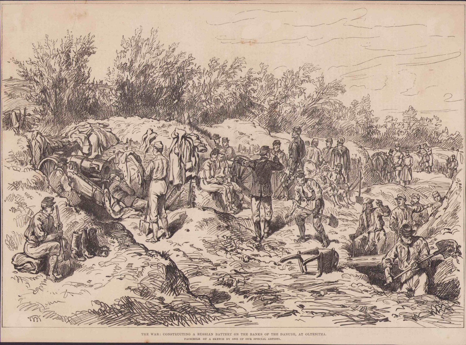 Sovyet ordusunun Tuna kıyısında siperlik inşasını yansıtan gravür, dergiden kesilmiş, 1877, 34x26cm