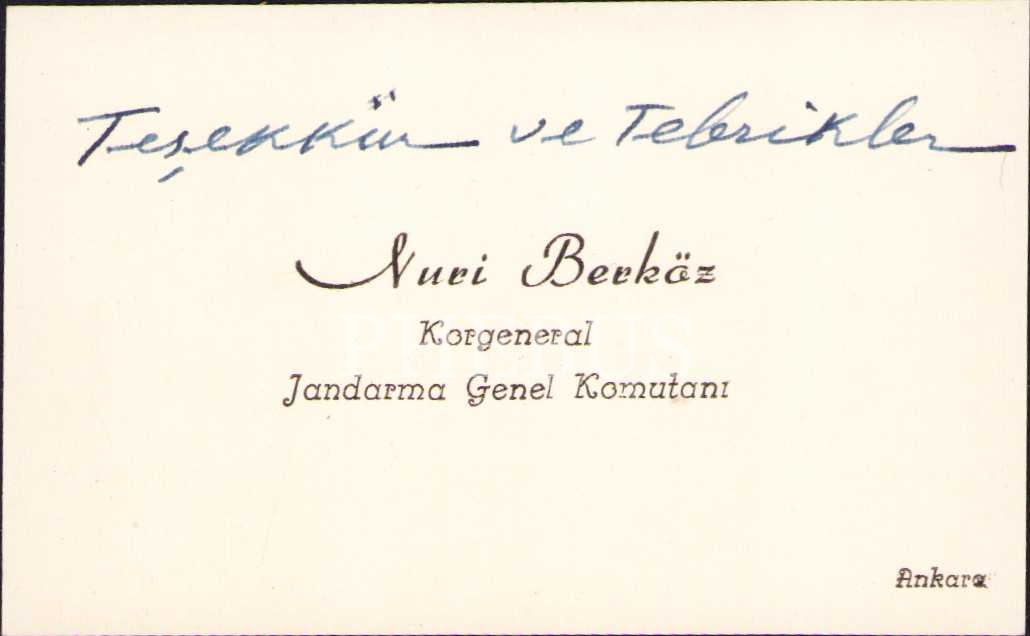 Nuri Berköz - Korgeneral / Jandarma Genel Komutanı yazılı kartvizit, 9x5 cm