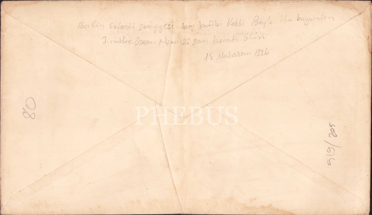 Osmanlıca Bab-ı Ali Daire-i Sadaret antetli Berlin Sefareti seniyyesi baş katibi Vehbi Bey'e ita buyrulan 3. rütbe Osmani Nişanı beratı alisi 15 Muharrem 1336 yazılı zarf, 28x16 cm