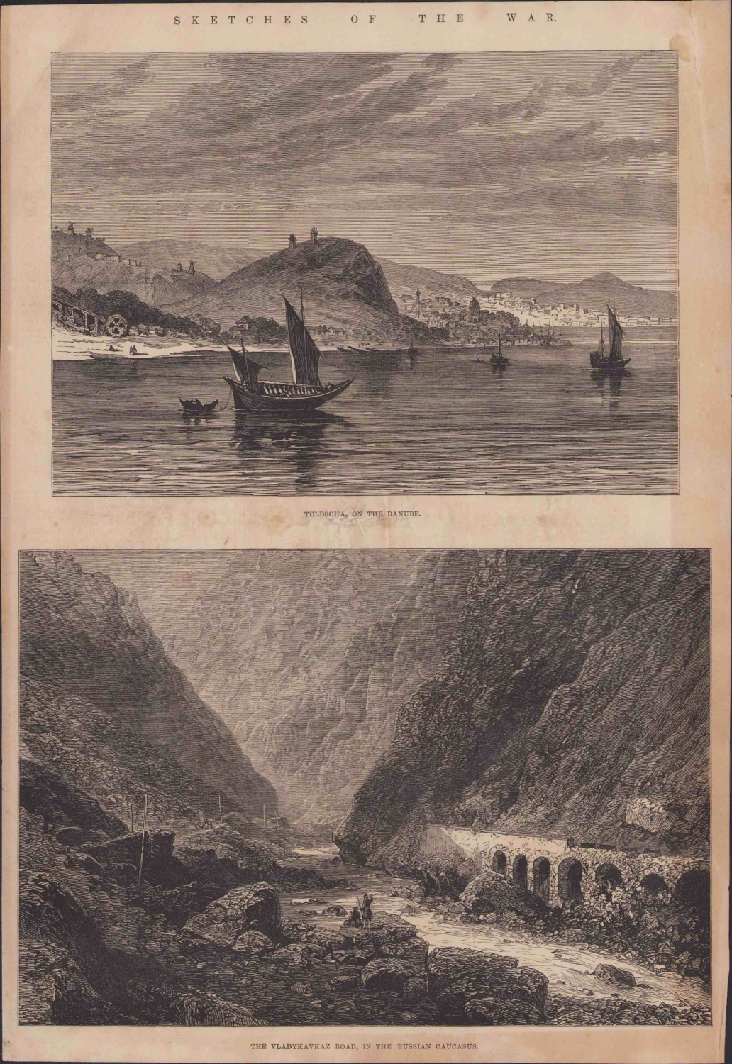 Tuna üzerinde seyreden yelkenliler ile Kafkasya yolu üzerindeki eski köprüyü yansıtan gravür resimler, 1877, dergiden kesilmiş, 25x36cm
