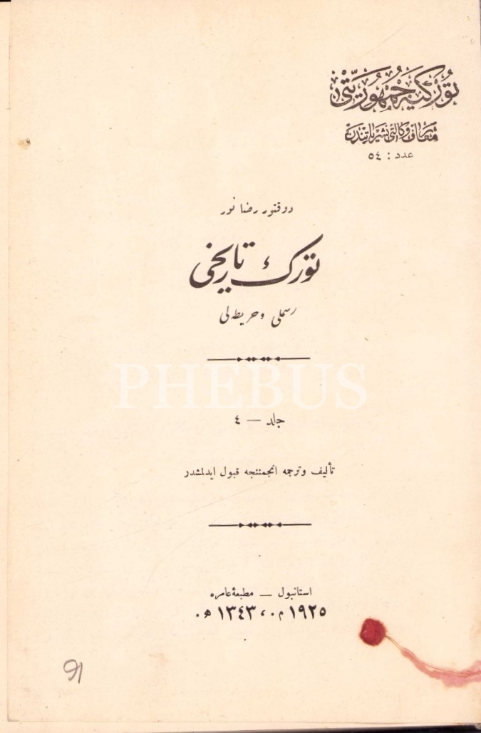 Osmanlıca Türk Tarihi [Resimli - Haritalı] - 4. Cilt, Doktor Rıza Nur, Matbaa-i Amire, İstanbul, 1925, 403 sayfa, 16x22 cm