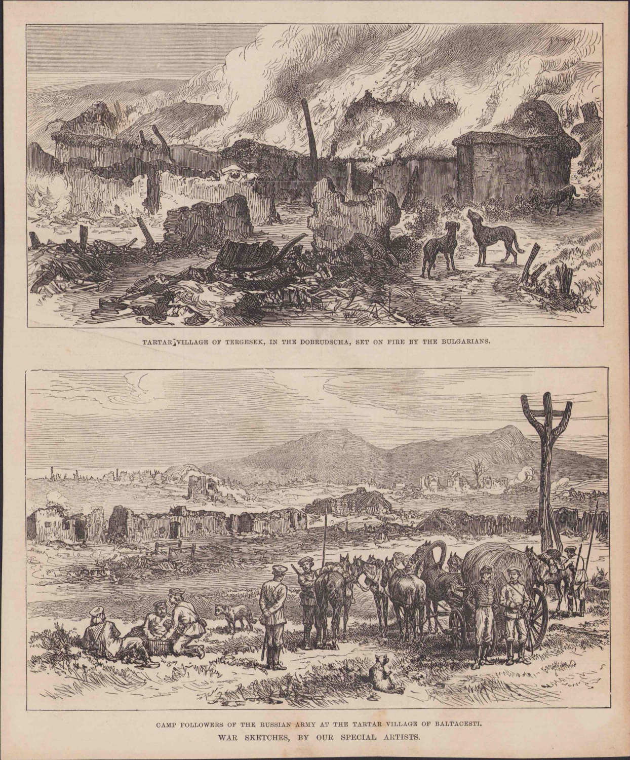 Dobruca'da Bulgarlarca yakılmış bir Tatar köyü ile bölgedeki Rus askerlerinin kampını yansıtan gravür resimler, 1877, dergiden kesilmiş, 23x28cm