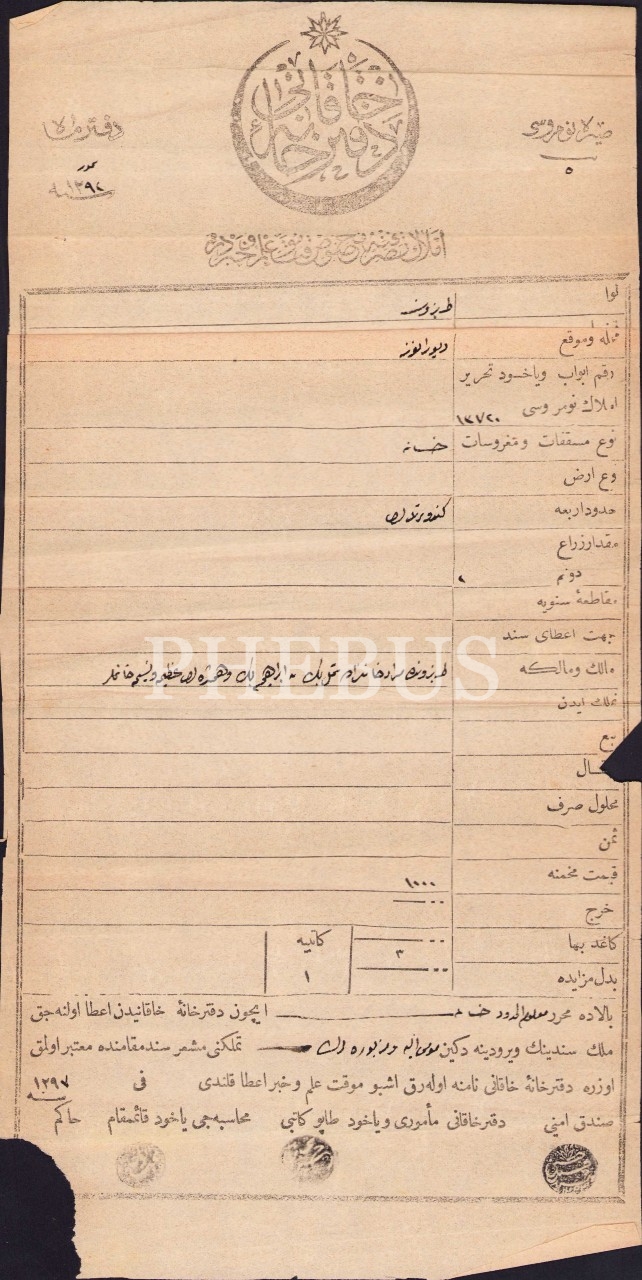 Osmanlıca tapu, Trabzon, 1297 tarihli, haliyle, 15x30 cm