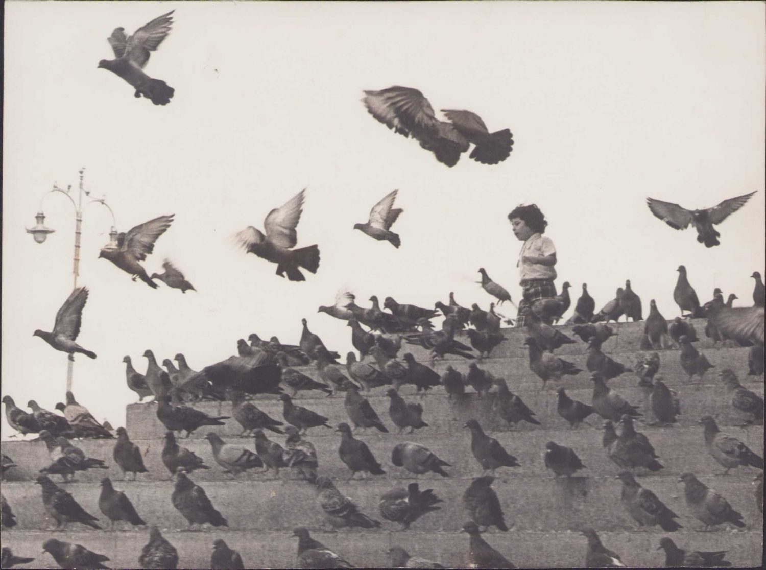 İstanbul'da kaldırımlar ve güvercinler, kuşları kovalayan kuş detaylı, 17x13cm