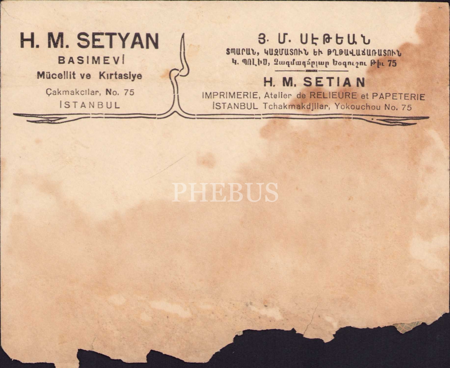 Türkçe, Ermenice ve Fransızca H. M. Setyan Basımevi - Mücellit ve Kırtasiye / Çakmakçılar - İstanbul yazılı zarf, haliyle