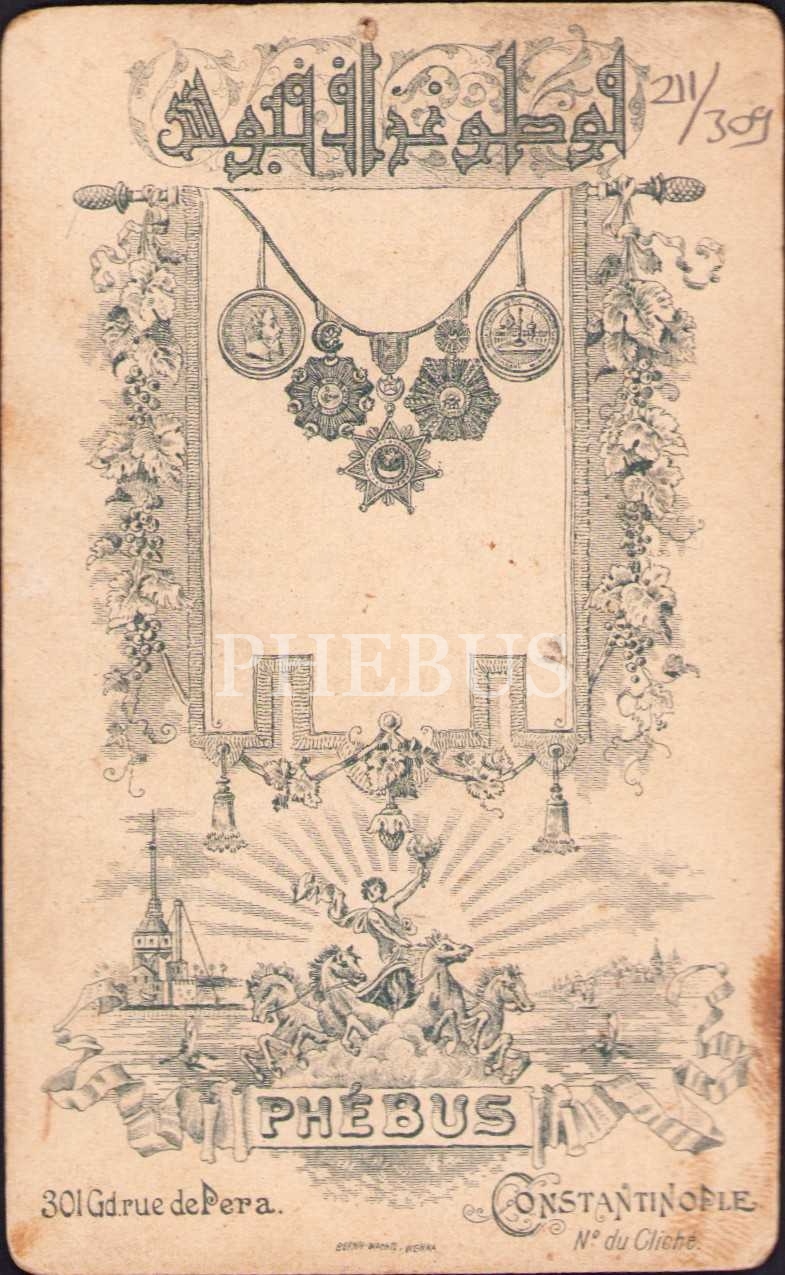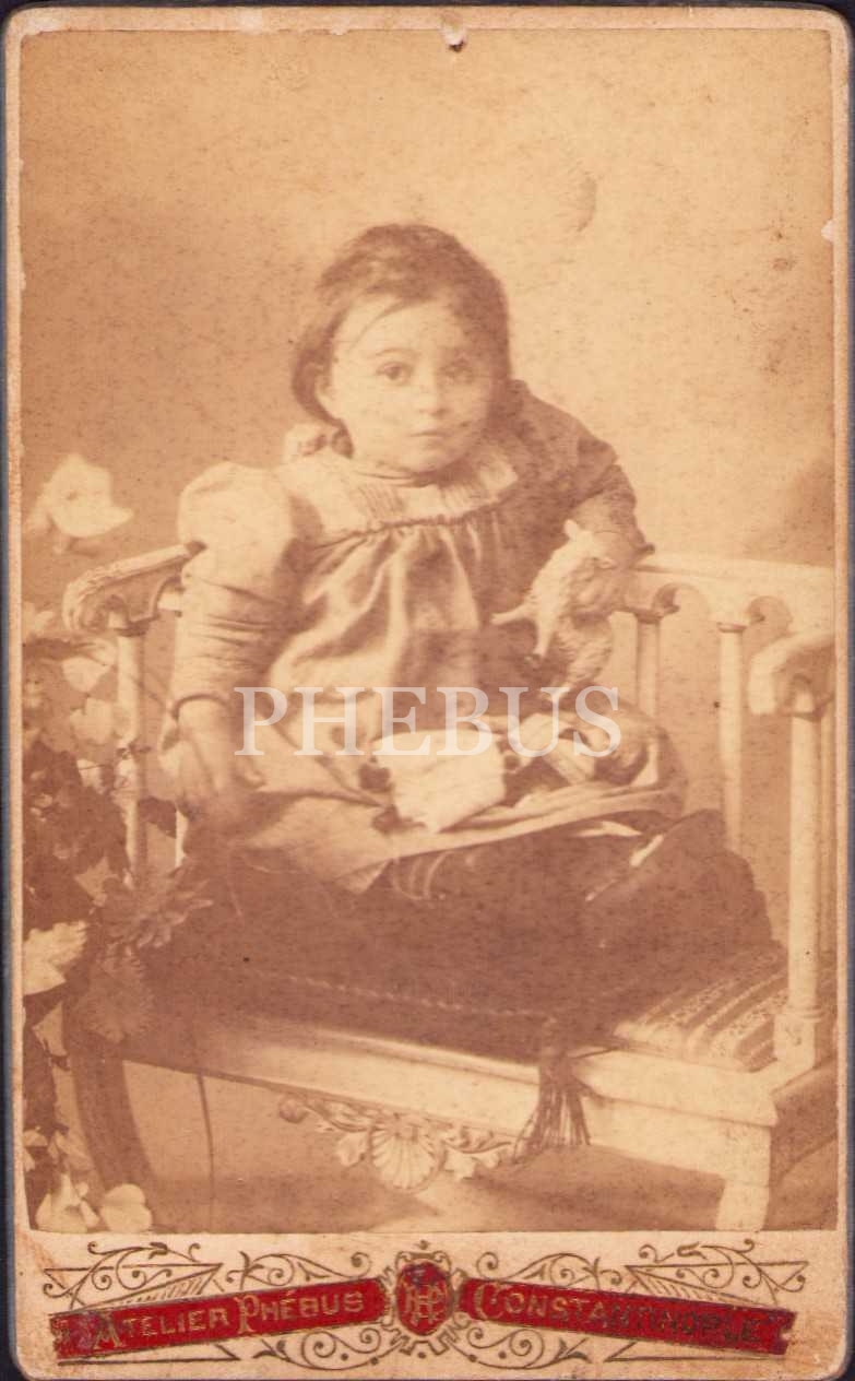 Osmanlı dönemi Phebus Fotoğrafhanesi, Constantinople, oyuncaklı kız çocuk, 6x11 cm