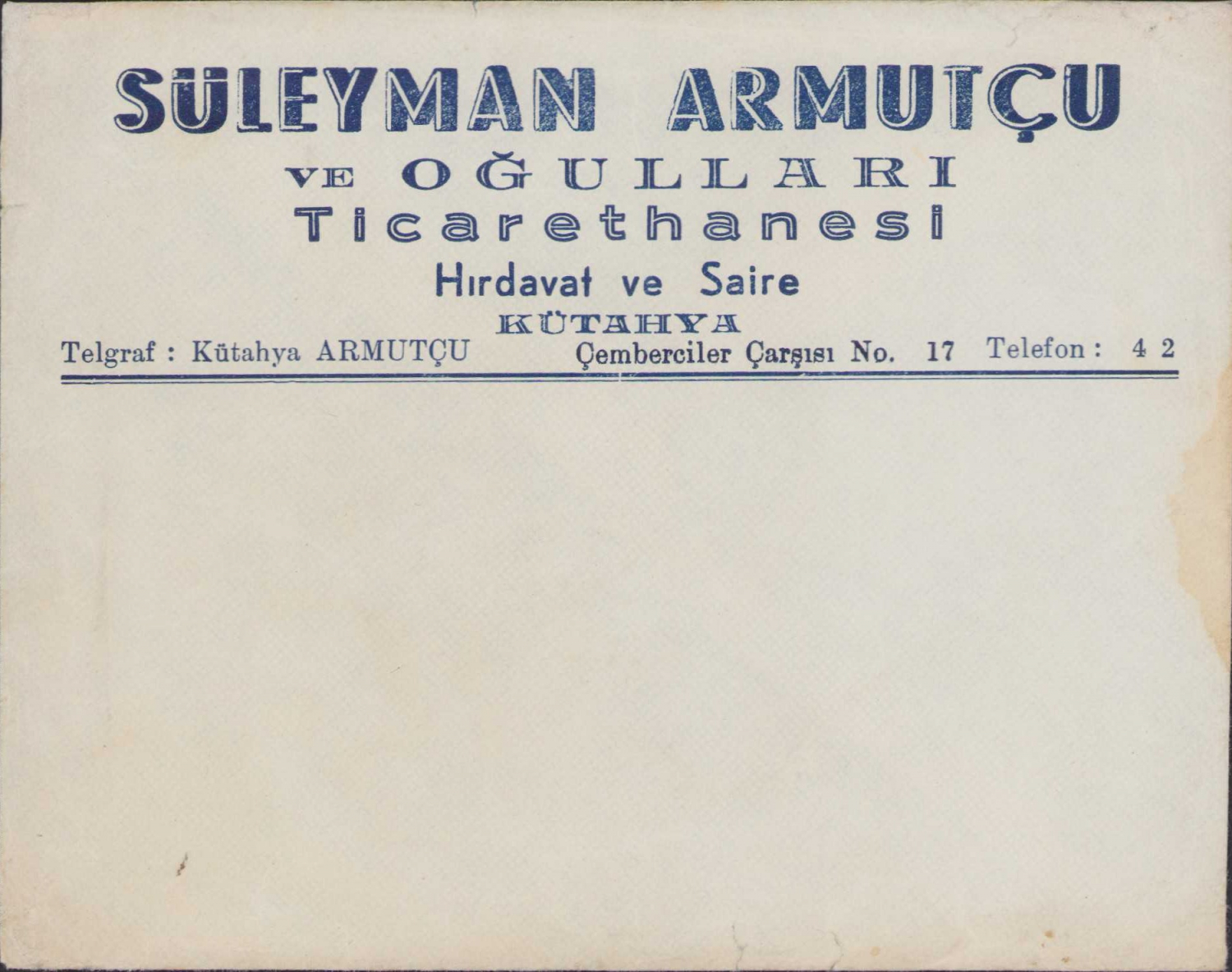 Süleyman Armutçu ve Oğulları Ticarethanesi Hırdavat ve Saire Kütahya antetli zarf, 16x12cm