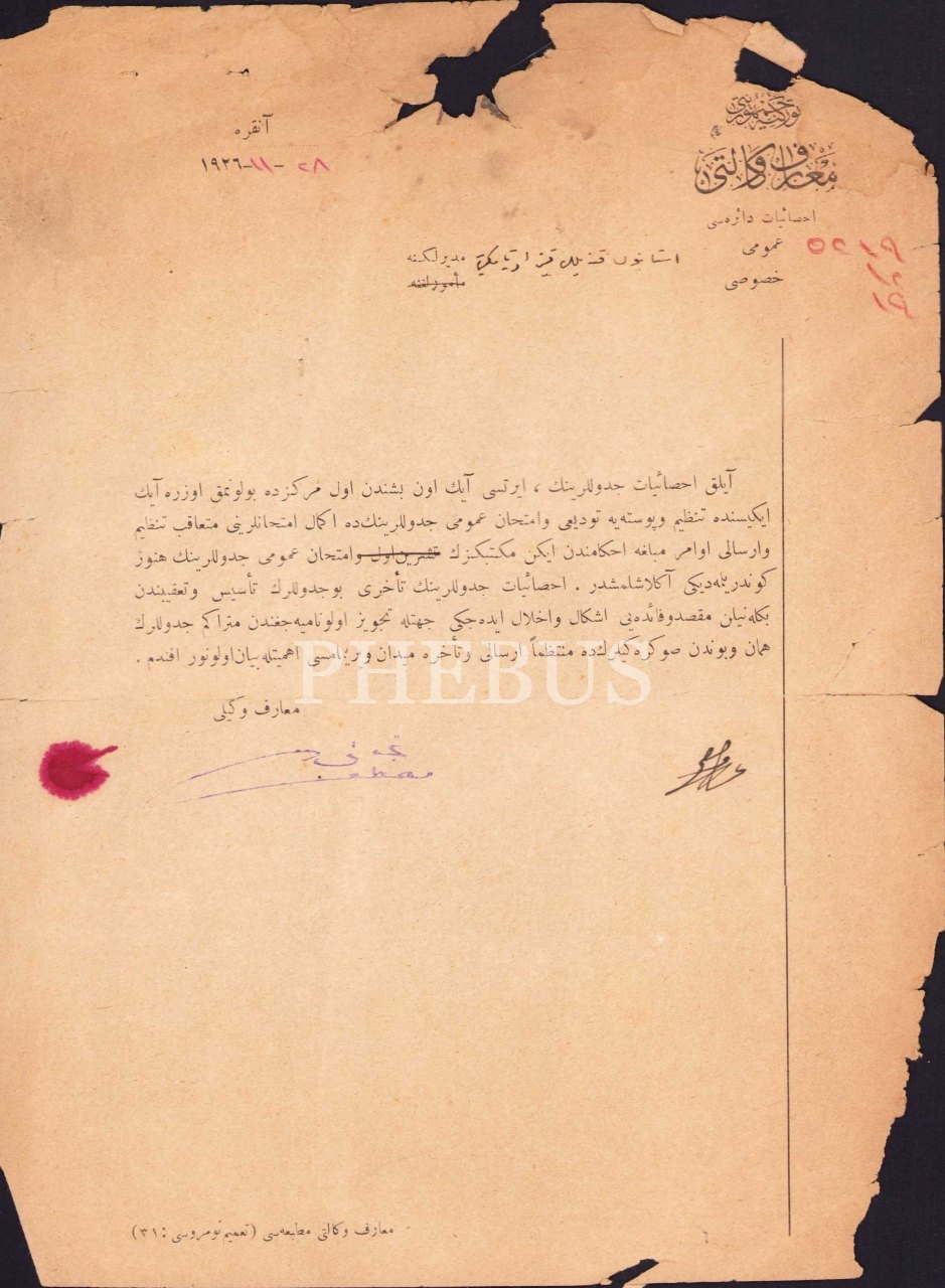 Osmanlıca Maarif Vekaleti antetli, İstanbul Kandilli Kız Orta Mektebi müdürlüğüne gönderilmiş, Maarif Vekili Mustafa Necati Bey imzalı evrak, haliyle, 18x24 cm