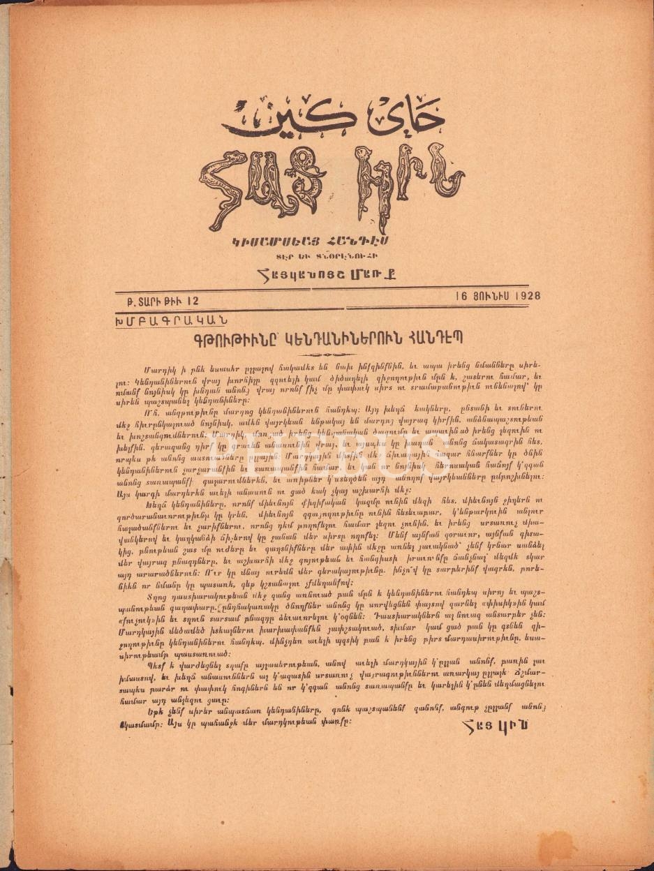 1928 tarihli Ermenice Hay Gın Kadın mecmuası, İmtiyaz sahibi Hayganuş Mark, 16 sayfa, 24,5x34 cm
