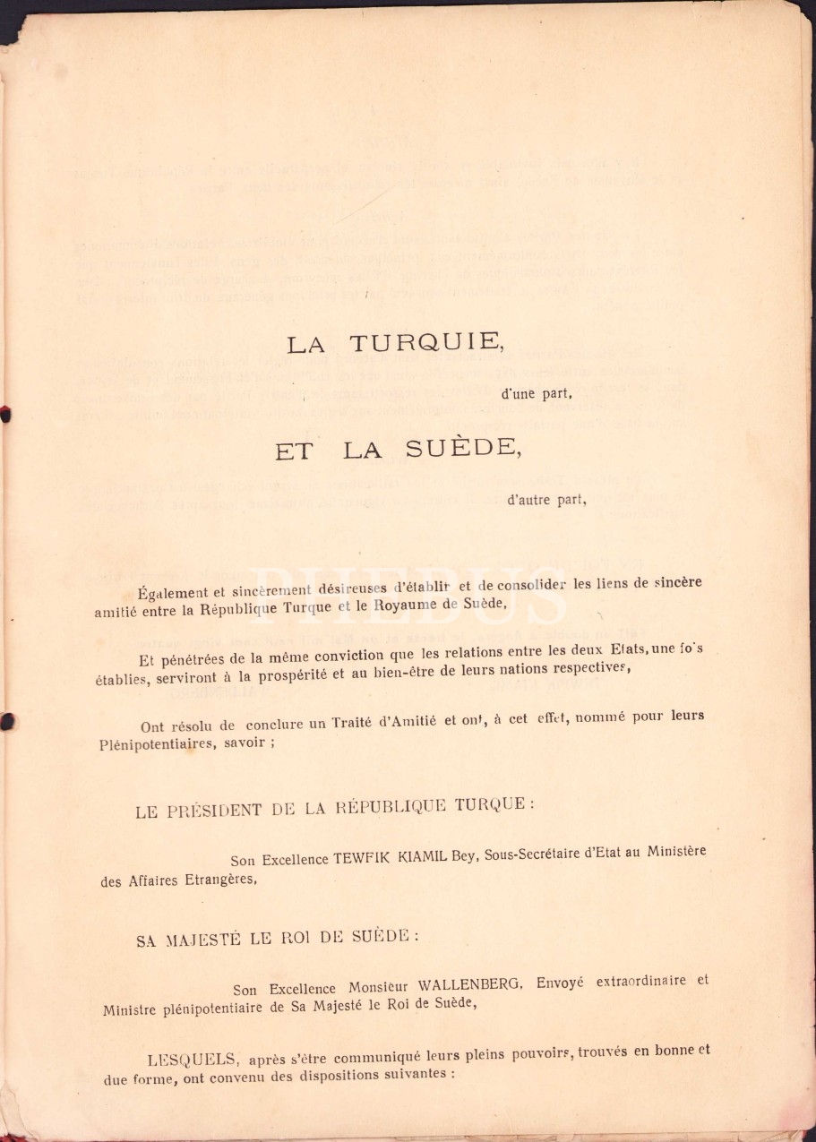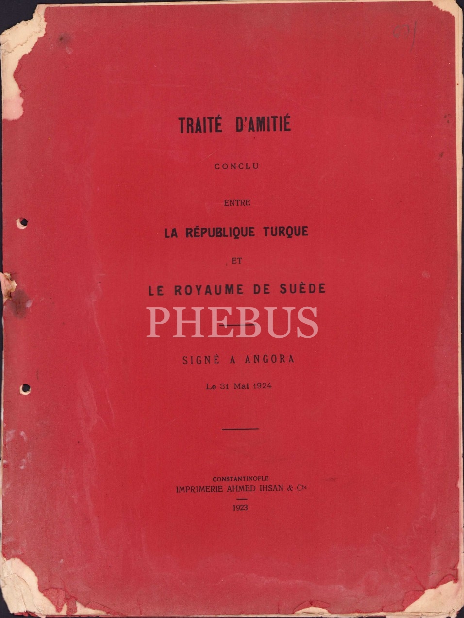 Osmanlıca Türkiye Cumhuriyeti ile İsveç Krallığı Arasında Mün'akid Muhadenet Muahhidnamesi, Ankara 31 Mayıs 1924 tarihinde imza edilmiştir. İstanbul 1340 baskı, 5 sayfa, 22x28 cm