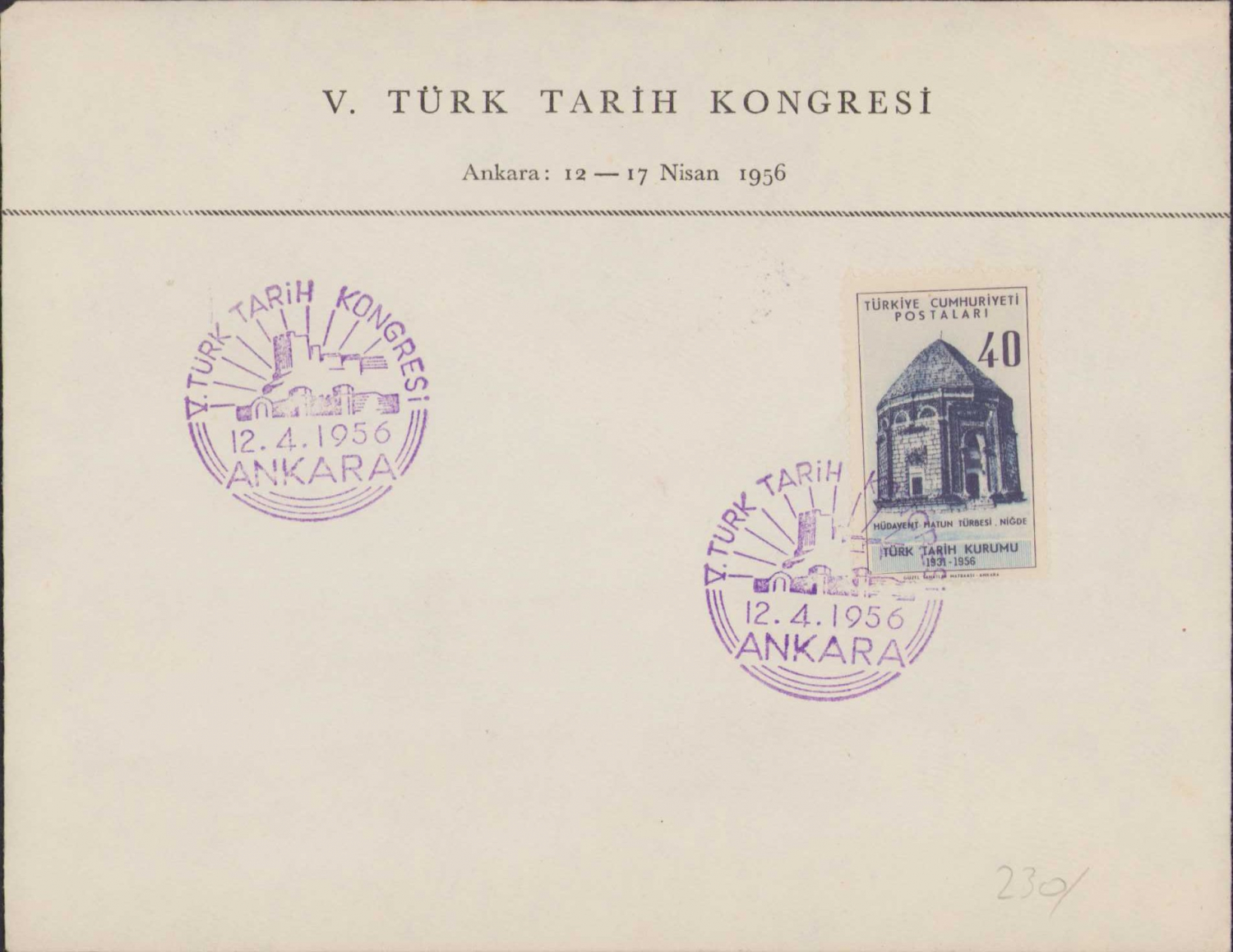 V. Türk Tarih Kongresi antetli zarf, 12 Nisan 1976 tarihli, pullu, damgalı, 16x12,5cm