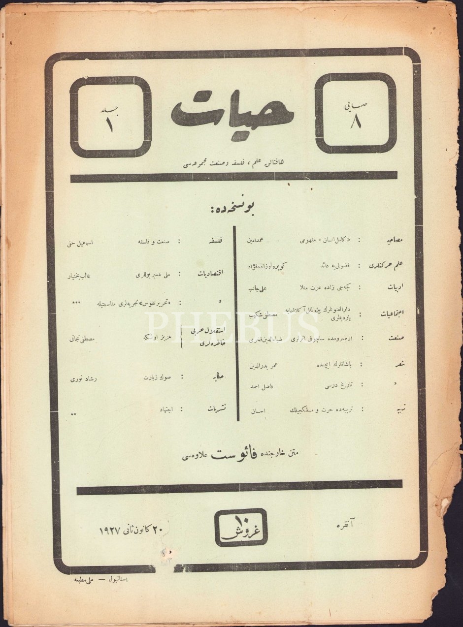 Osmanlıca Hayat Mecmuası [1. Cilt - 8. Sayı], 20 Kanunusani 1927, Milli Matbaa, İstanbul, sırtı haliyle, 20 sayfa, 24x32 cm