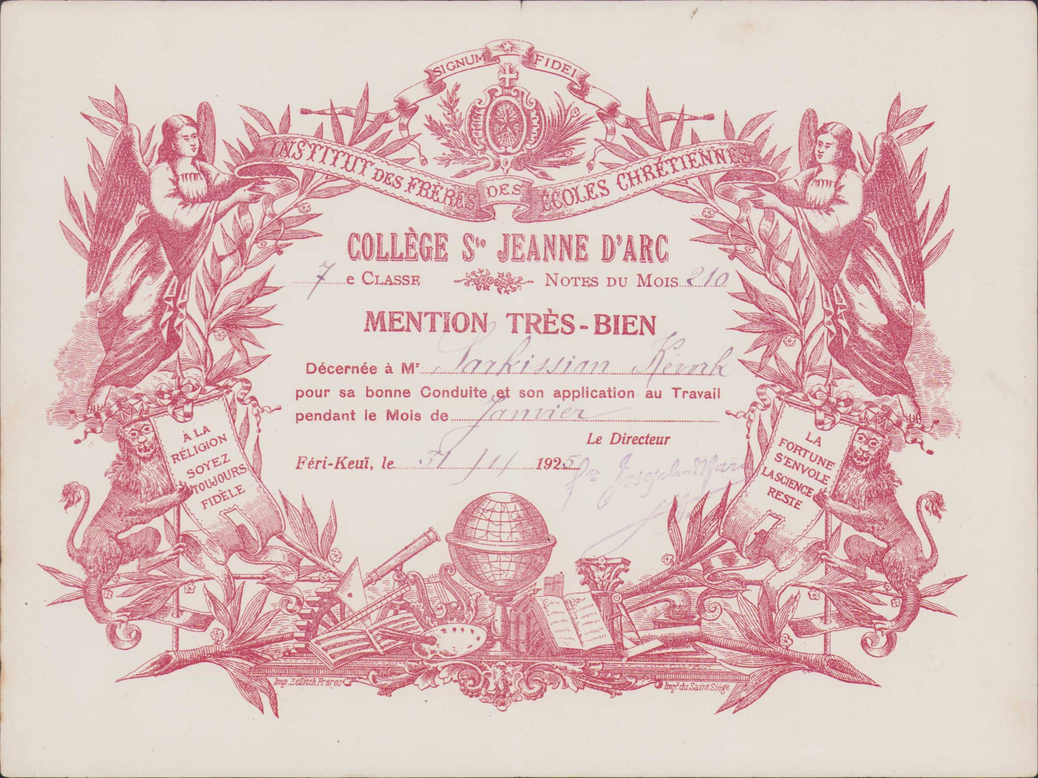 Fransız Sainte Jeanne D'Arc Kolejin'den dil becerisi üzerine verilmiş mansiyon, 1952 tarihli, Kadıköy adresli, Fransızca, 23,5x17,5cm