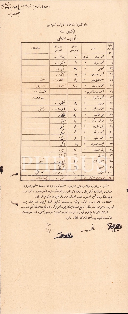 Osmanlıca Darülfünun Edebiyat şubesi ikinci sene mezuniyet sınav belgesi, 16x49 cm
