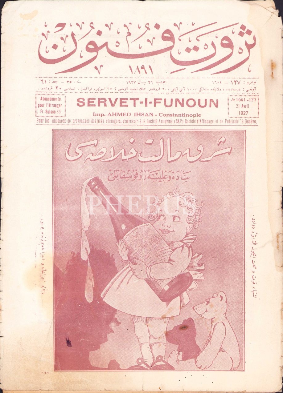Osmanlıca Serveti Fünun Gazetesi, 21 Nisan 1927, " Sade Gliserin ve Fosfatlı: İştaha, Kuvvet ve Sıhhat İçin En Müessir Devadır", kapak haliyle, 48 sayfa, 24x34 cm
