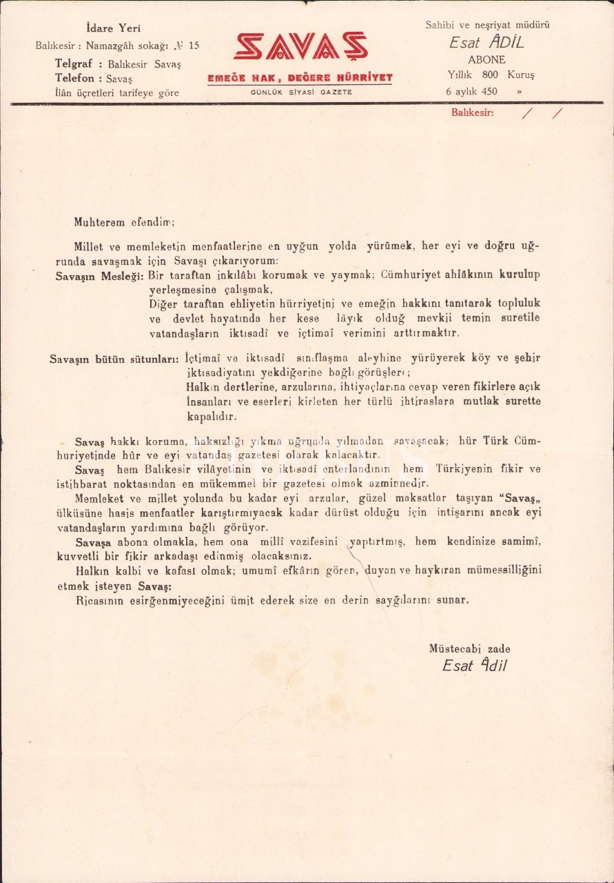 Esat Adil - Savaş Gazetesinin çıkış sebebi ve amaçlarını anlatan beyanname, 21x28 cm