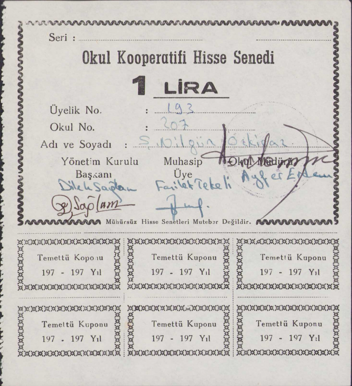 Okul Kooperatif Hisse Senedi, ederi 1 lira, 12,5x13,5cm