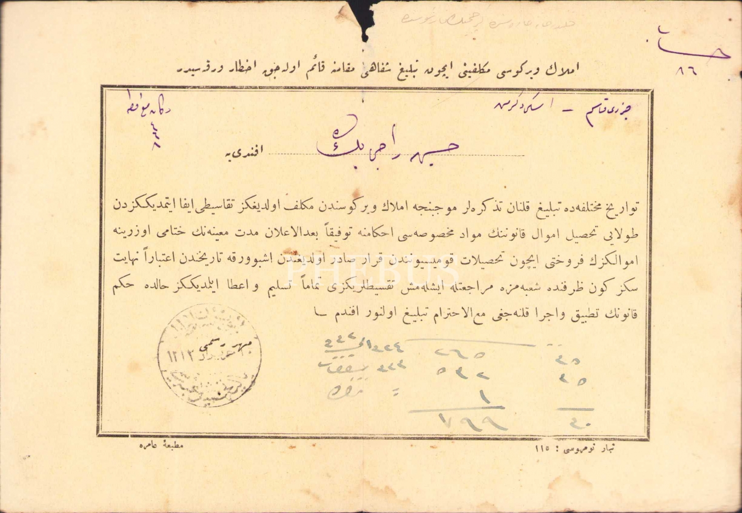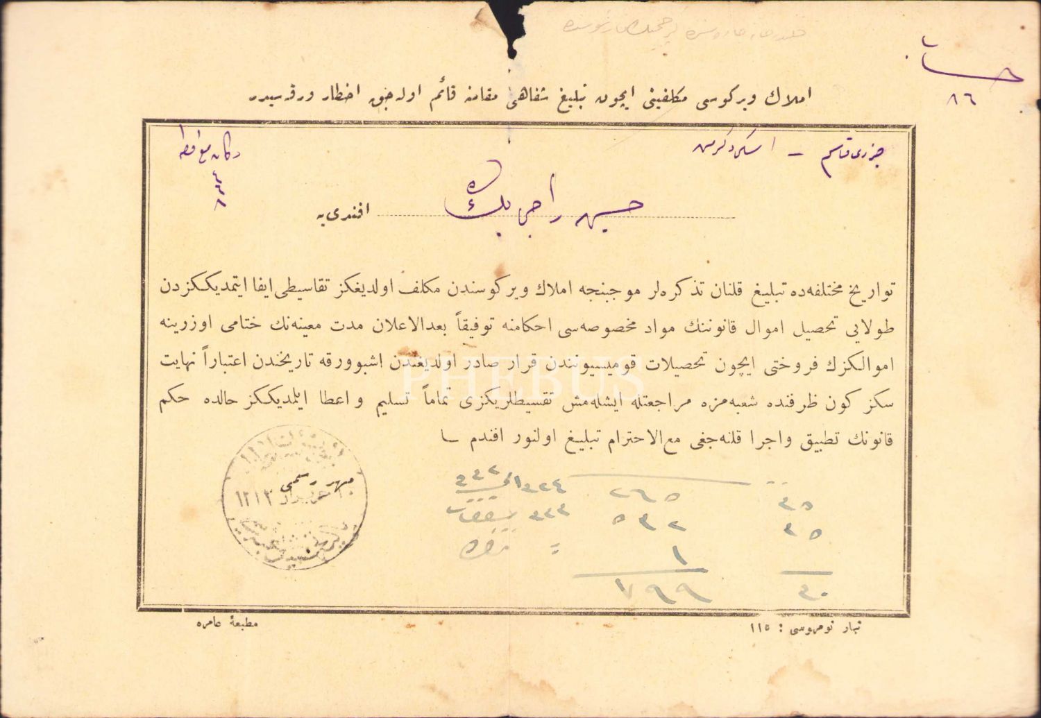 Osmanlıca vergi makbuz senedi, haliyle, 20x13 cm