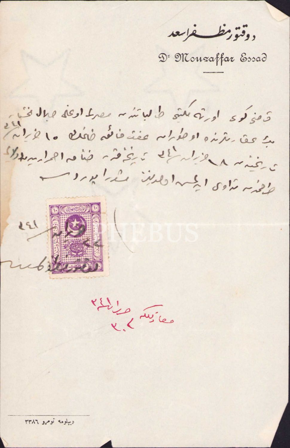 Osmanlıca Doktor Muzaffer Esat antetli 1341 tarihli reçete, 12x16 cm