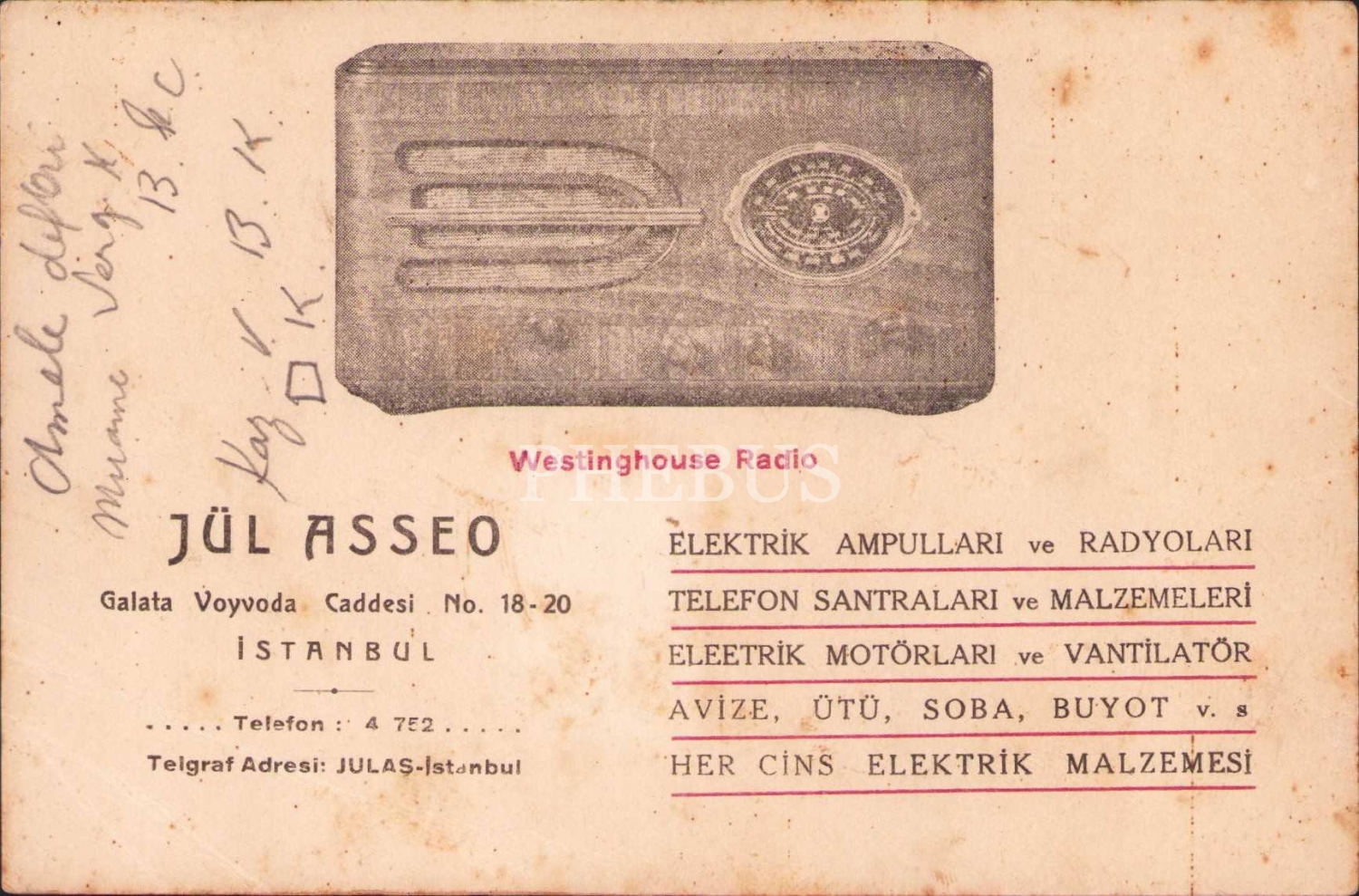 Jül Asseo - Her Cins Elektrik Malzemesi reklam kartı, arkası damga pullu, 15x10 cm