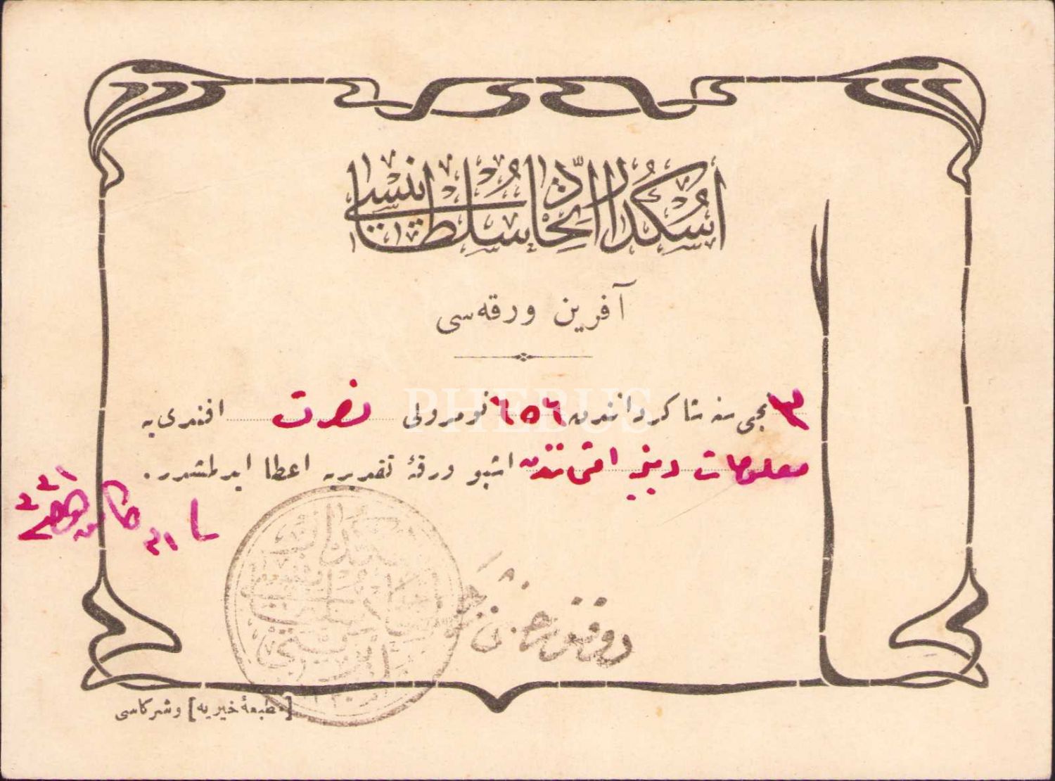 Osmanlıca aferin, Üsküdar İttihat Sultanisi, 13x9 cm