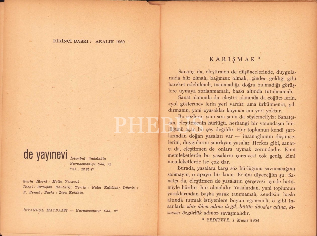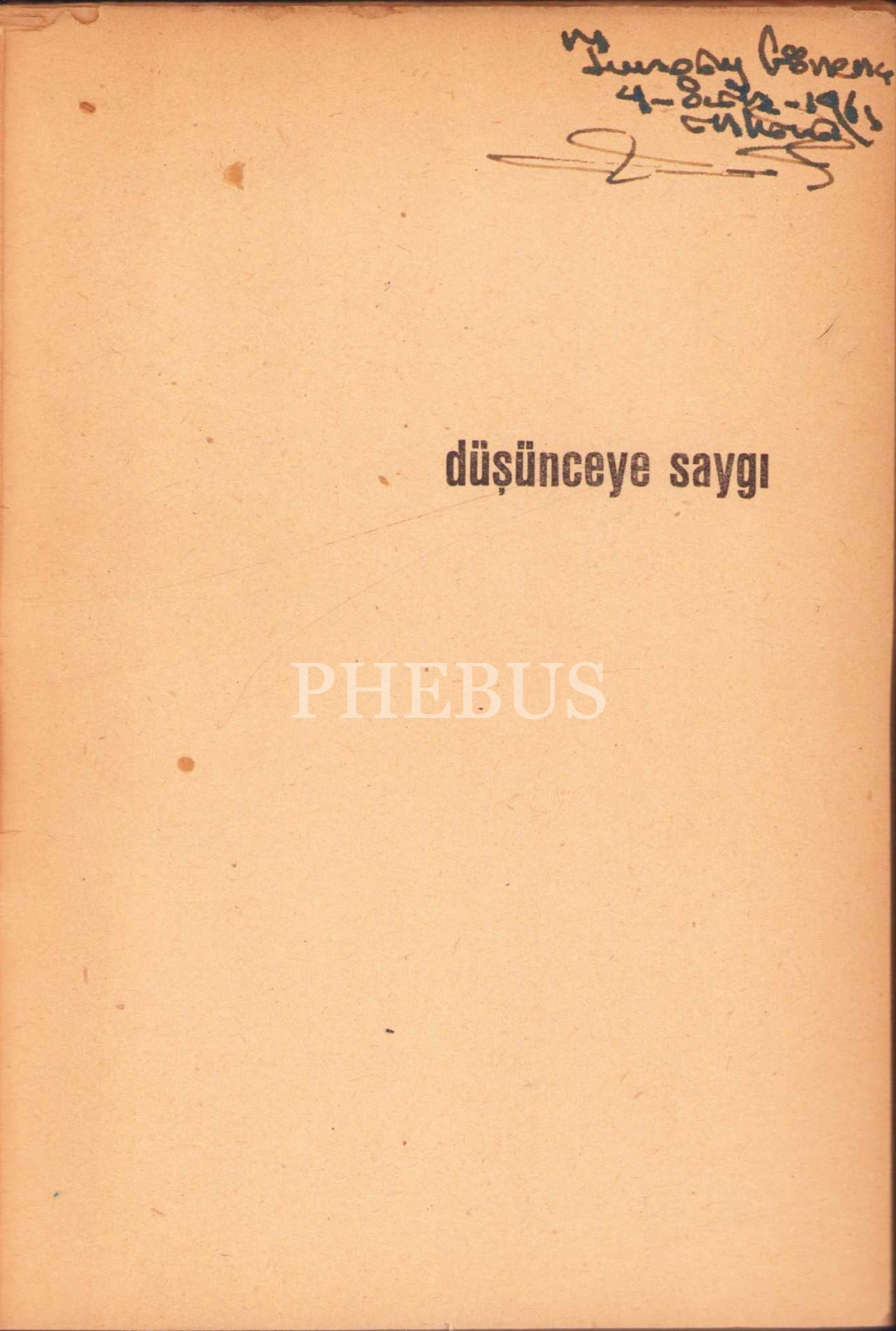 Düşünceye Saygı, Mehmet Fuat, De Yayınları - Birinci Baskı: Aralık 1960, ilk sayfasına ''Turgay Gönenç - 4 Ocak 196(?) Ankara'' yazılmış, 112 sayfa, 12x17 cm