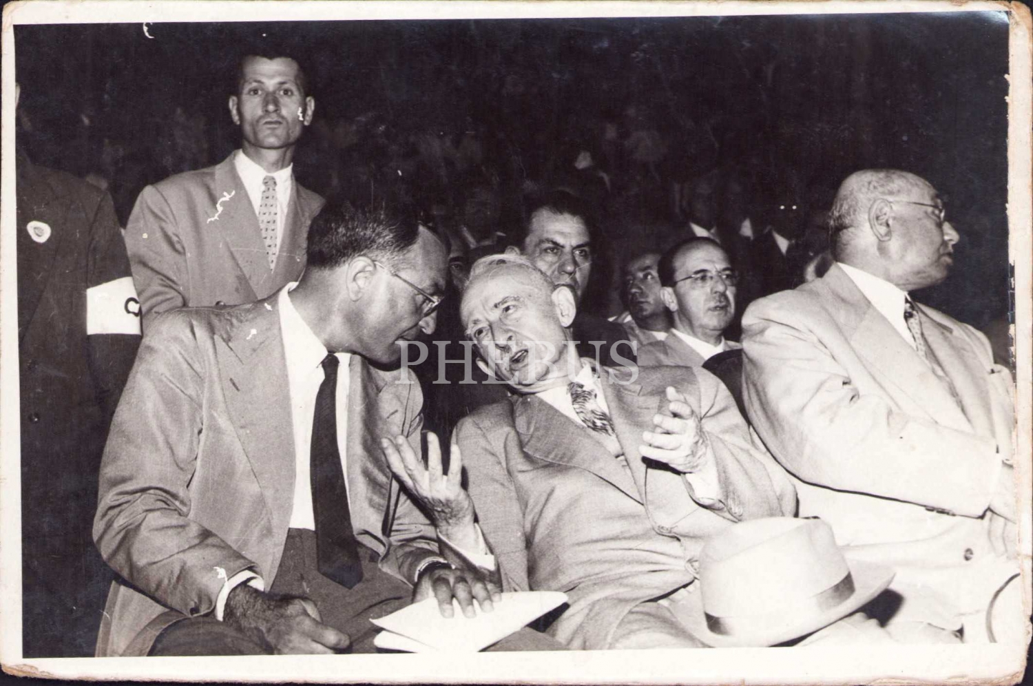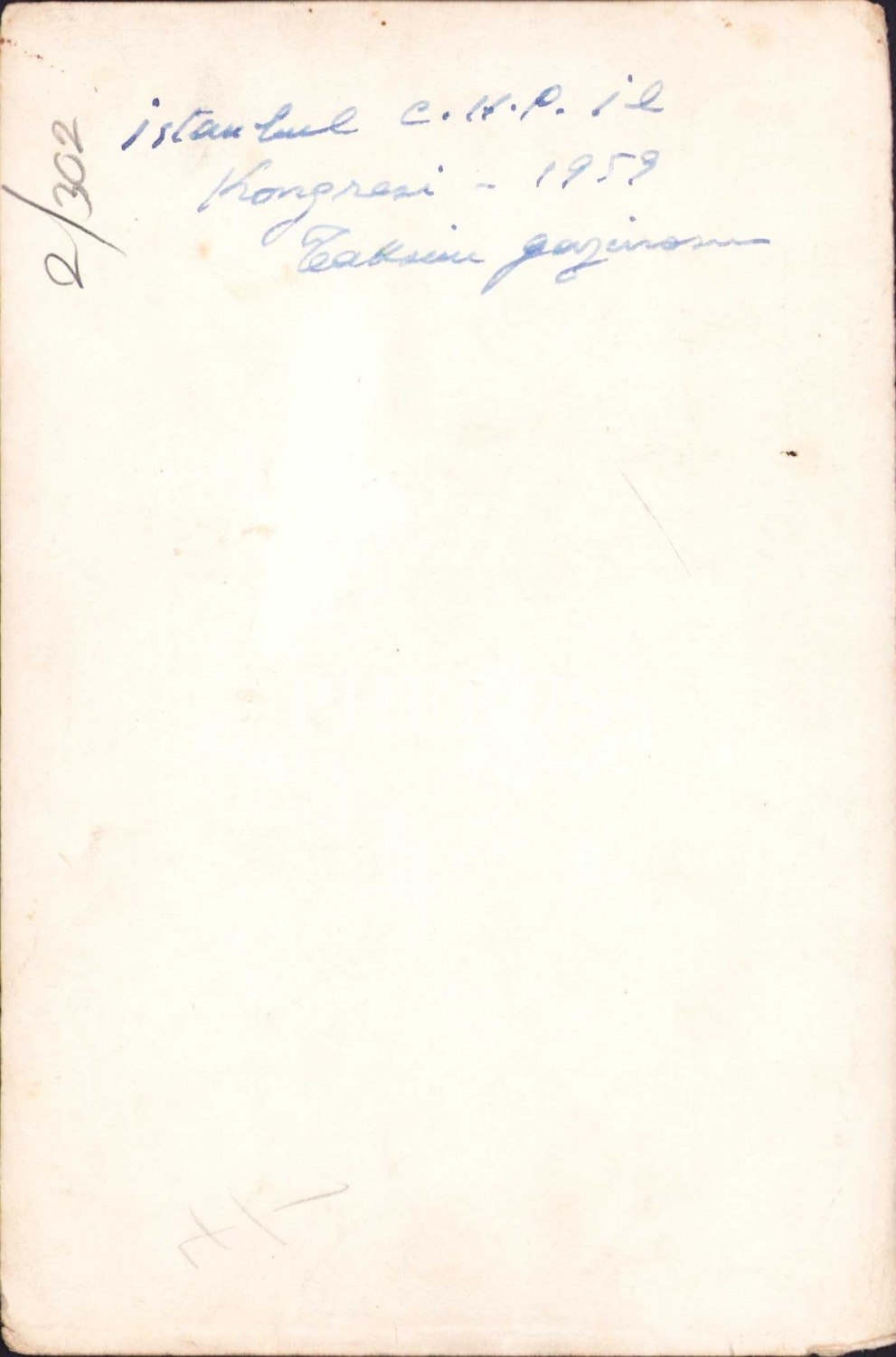 İsmet İnönü Kasım Gülek ve Şemsettin Günaltay'la beraber 1959 C.H.P. İstanbul İl Kongresinde, Taksim Gazinosu, 18x12 cm, kenarları yorgun