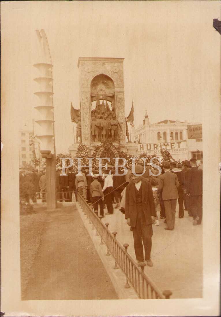 Erken cumhuriyet döneminden Taksim Cumhuriyet Anıtı ve Topçu Kışlası, 1933, 10. Yıl kutlamaları, 6x9 cm