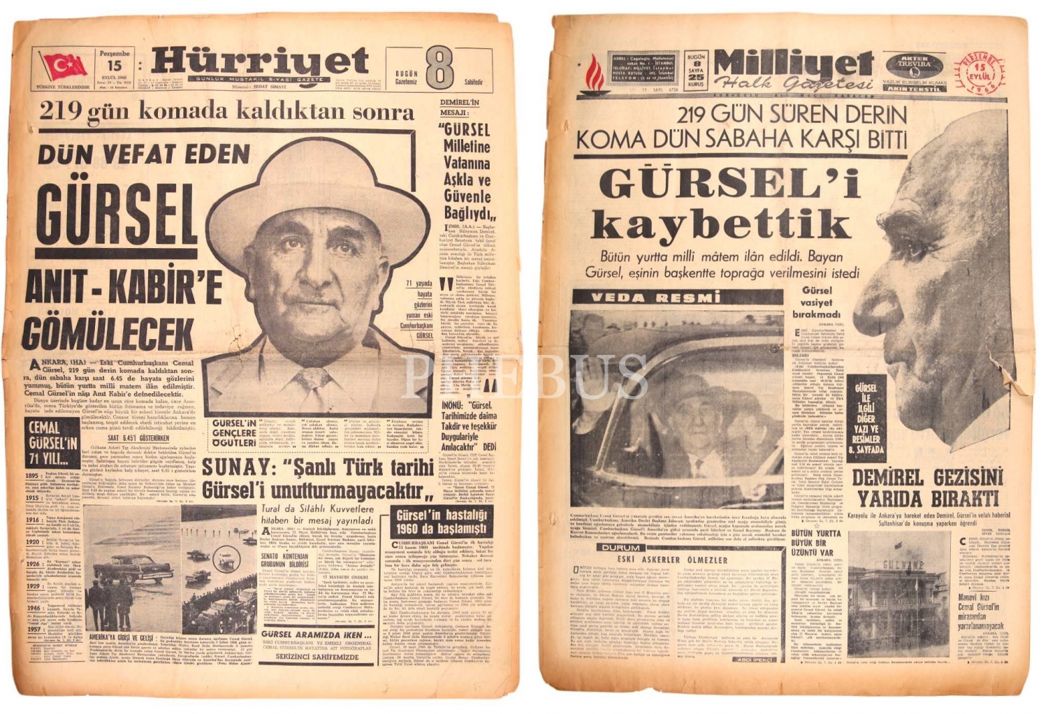 Cemal Gürsel'in ölümüyle alakalı Hürriyet ve Milliyet Halk Gazetesi, 15 Eylül 1966, 60x42 cm