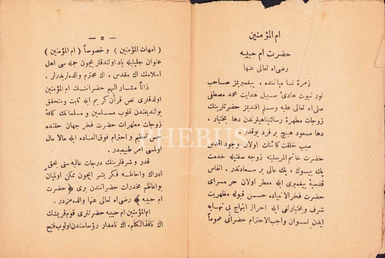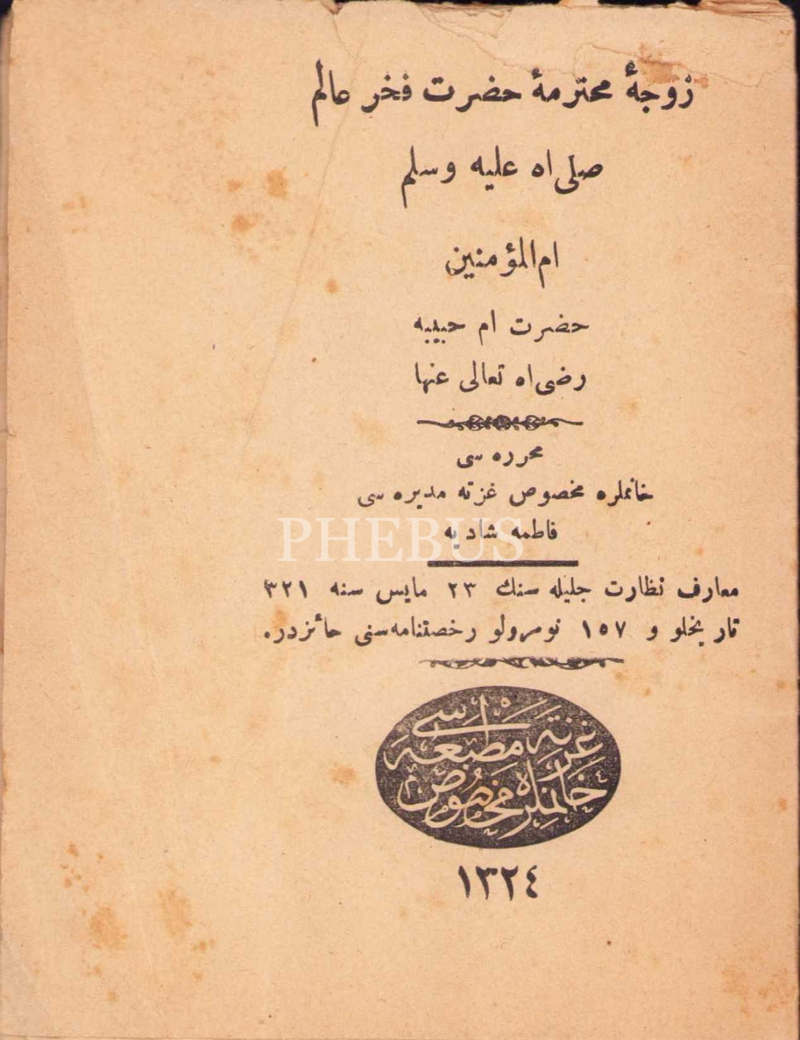 Osmanlıca Zevce-i Muhtereme-i Hazret-i Fahr-i Ålem Sallallahu Aleyhi ve Sellem Ümm-i Habibe Radıyallahu Teala Anha, Fatma Şadiye, Hanımlara Mahsus Gazete Matbaası, İstanbul 1324, 28 sayfa, 10x13 cm