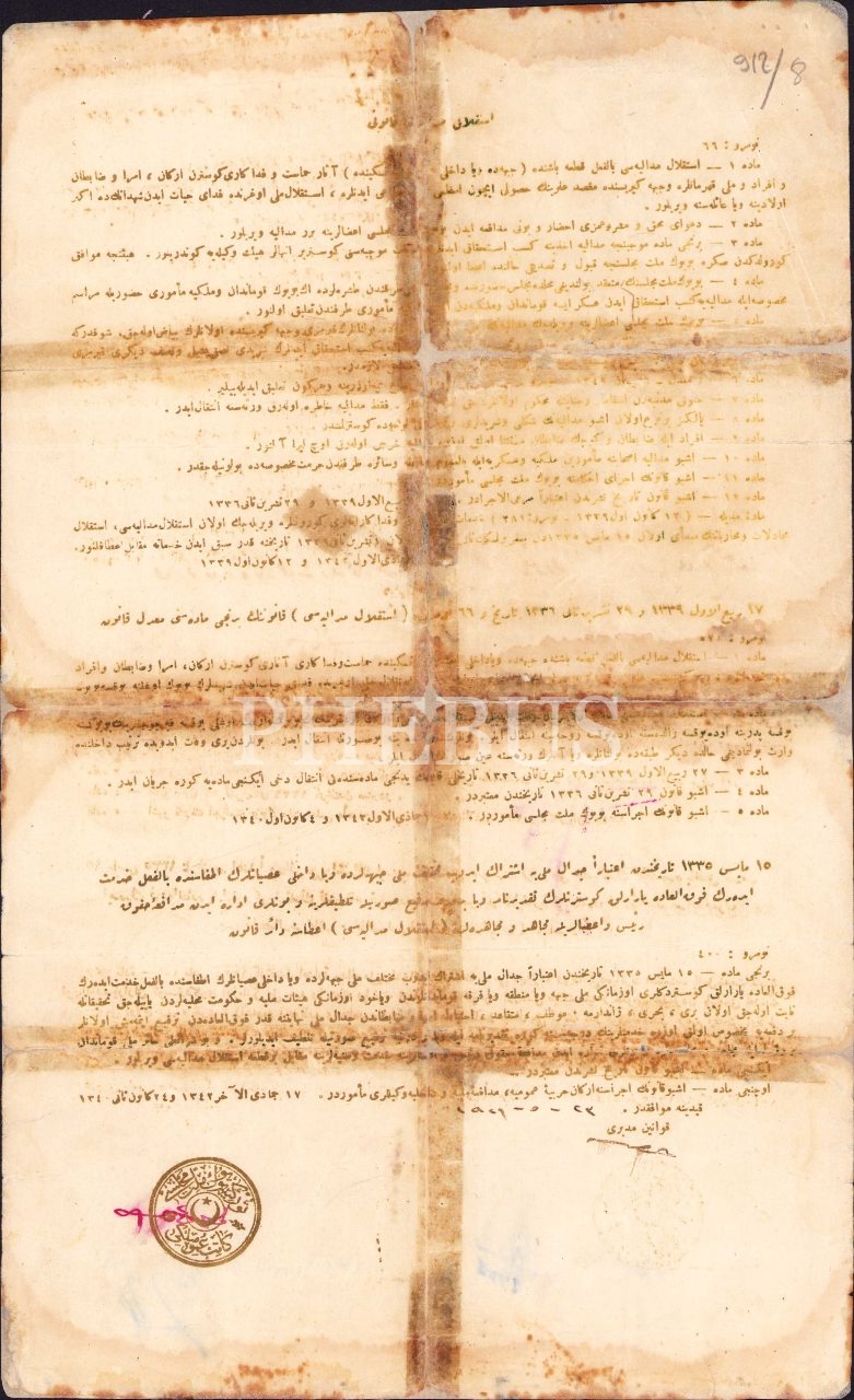 Mustafa Kemal Atatürk Osmanlıca Islak İmzalı Beyaz Şeritli İstiklal Madalyası Beratı, Cumhuriyet Halk Fırkası Azasından Mumcuzade Hakkı Efendi'ye verilmiş, 8 Ağustos 1926, 22x37 cm