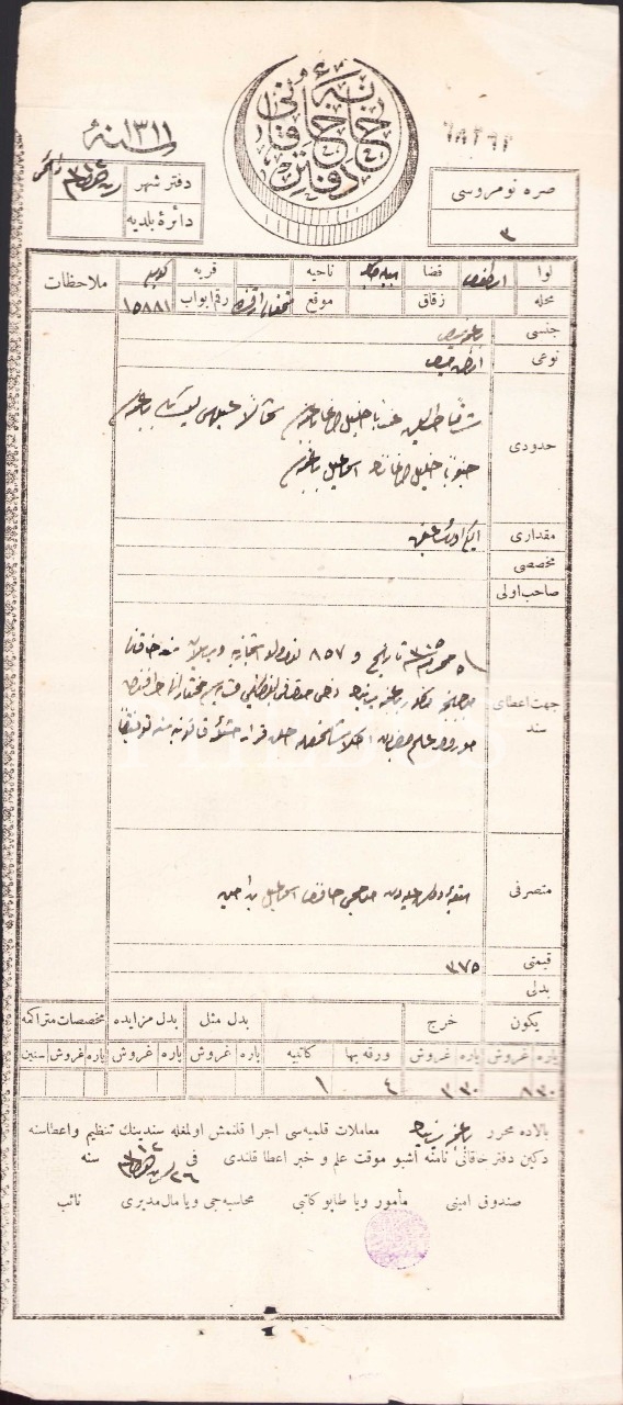 Osmanlıca tapu, Bilecik, 26 Teşrin-i Evvel 1312, 14x33 cm